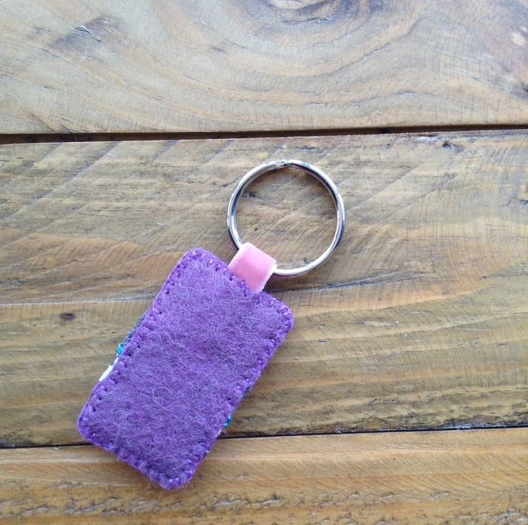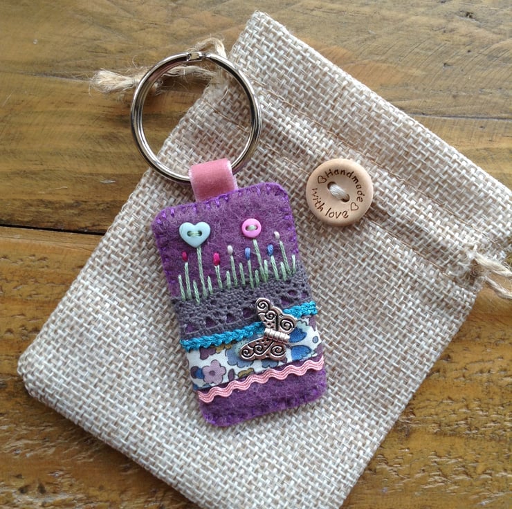 I have embellished a rectangle of felt with lace, Liberty fabric, trimmings, a Tibetan silver butterfly bead and a hand sewn meadow of tiny buttons and flowers.