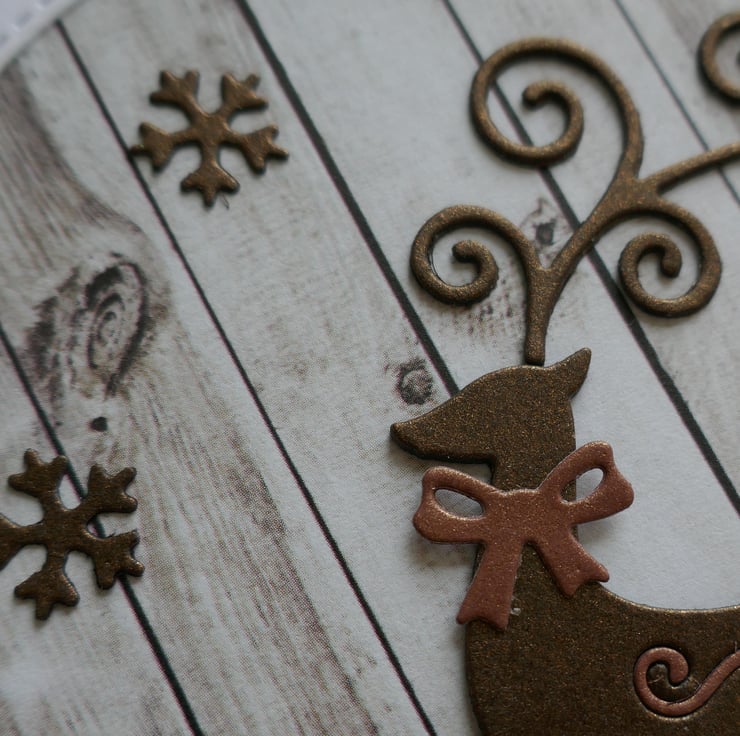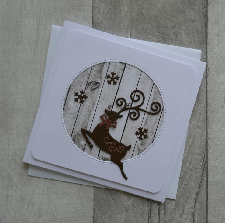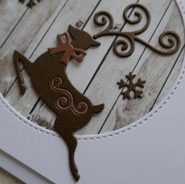 A stitched circle has been die cut from the centre of a panel of white card and the corners have been rounded. A piece of wood effect card has been attached behind the aperture. The reindeer has been die cut from dark brown card and attached in the lower corner. A small light brown swirl has been inlaid into the reindeer's back and a small bow attached to his neck. Three small dark brown snowflakes have been attached to the background.