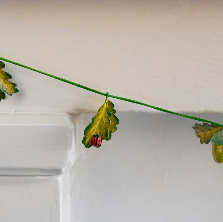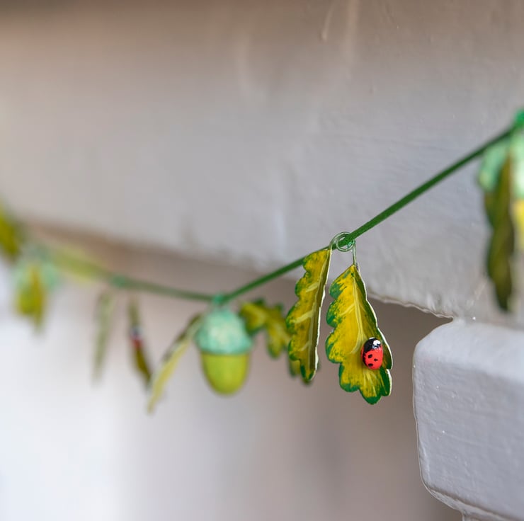 This delicate garland is made using paper mache and card acorns and oak leaves hanging on a soft cord. Each individual acorn is pressed out of a mold, finished, sealed, hand-painted and varnished for longevity. Look closely and you can spot some little ladybirds hiding in the leaves!