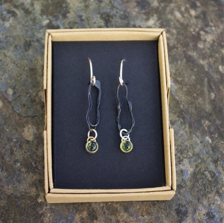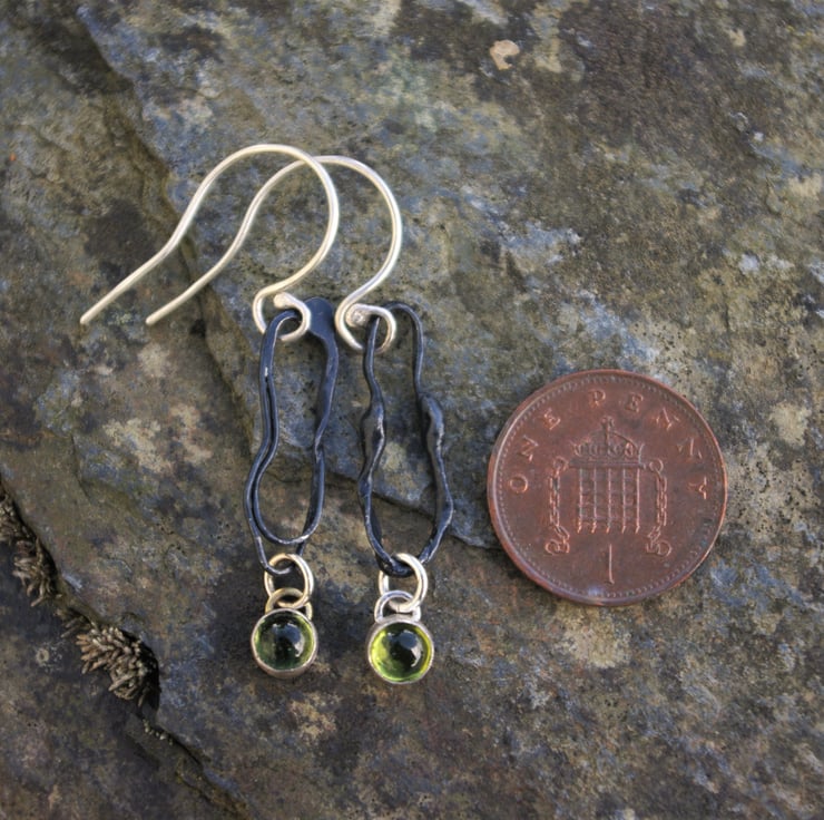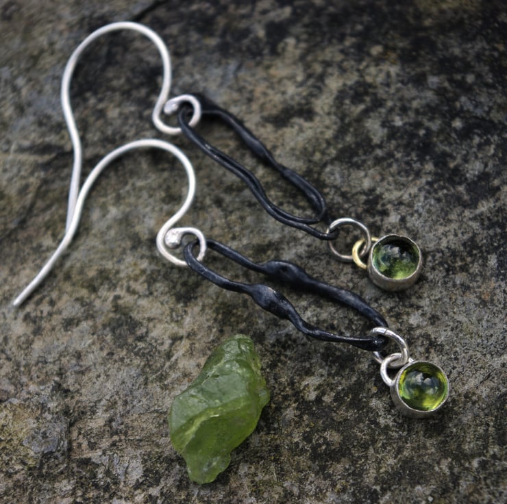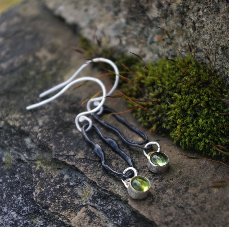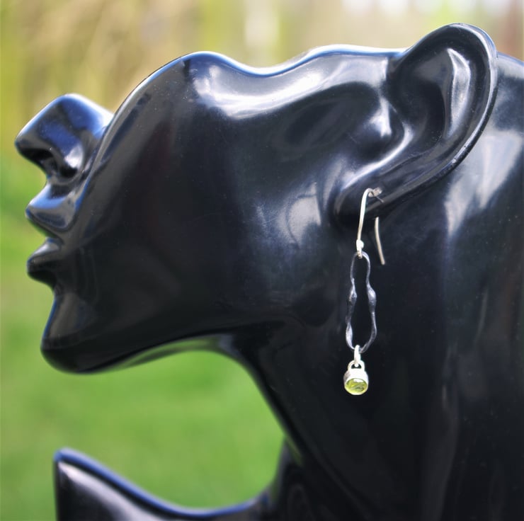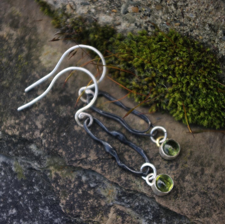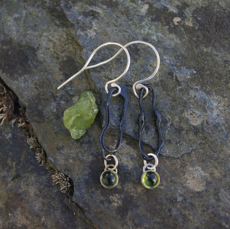 A Peridot set in sterling silver dangles from an 'organic; twirl of silver wire , which I have oxidised to black . The black is preserved with sealer , but will gradually fade with handling. However I think they will look great as they fade and be interesting while they change to a more silvery-black.
