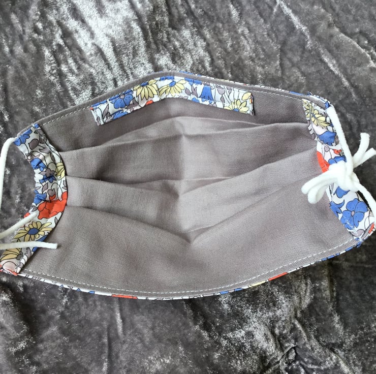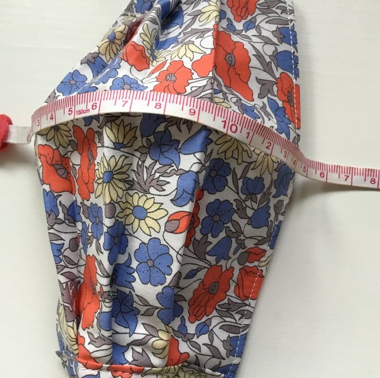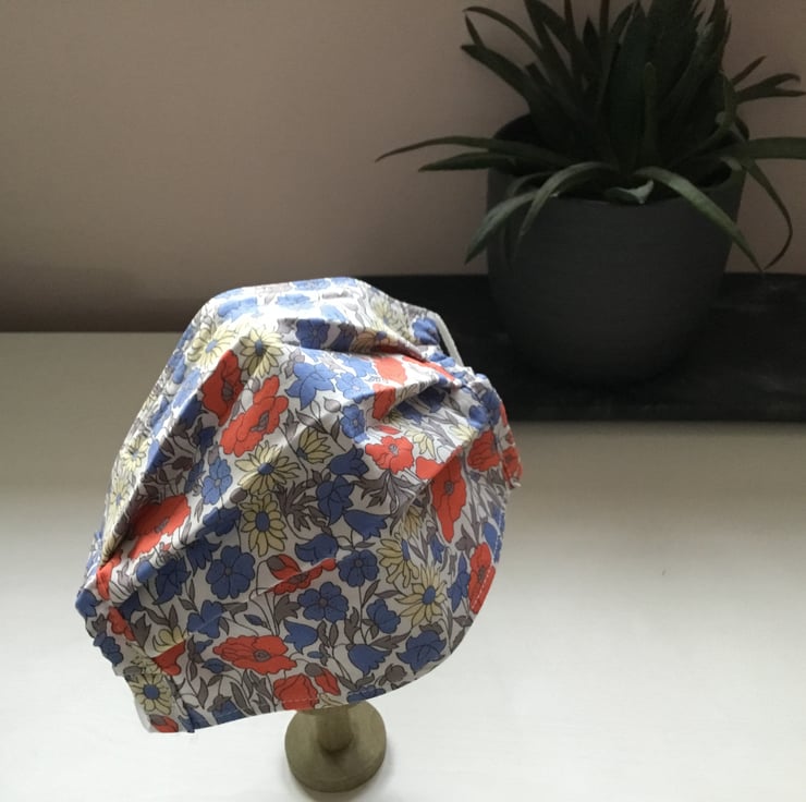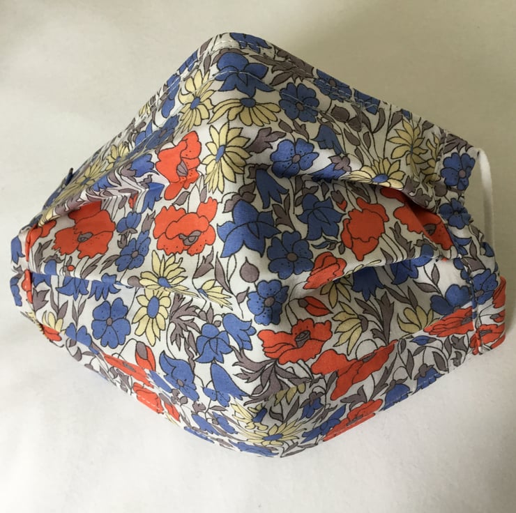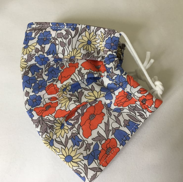 Face covering made from Liberty’s Poppy and Daisy cotton Tana lawn fabric. Triple layered and with a nose wire, adjustable ear elastic, 30 cm each side for you to adjust to size. Pull up the sides for a snug fit.