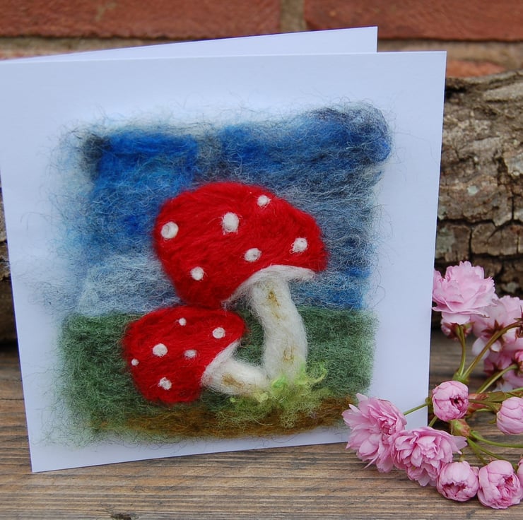 A bank greetings card decorated with Mushrooms made by needlefelting unspun fibre onto a piece of reclaimed wool blanket.