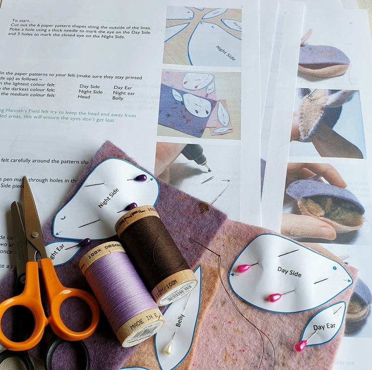 You will also need 2 colours of sewing thread, one to match your felt and the other in black or dark brown for the eyes, along with some filling and the usual sewing kit of scissors, pins and needle.