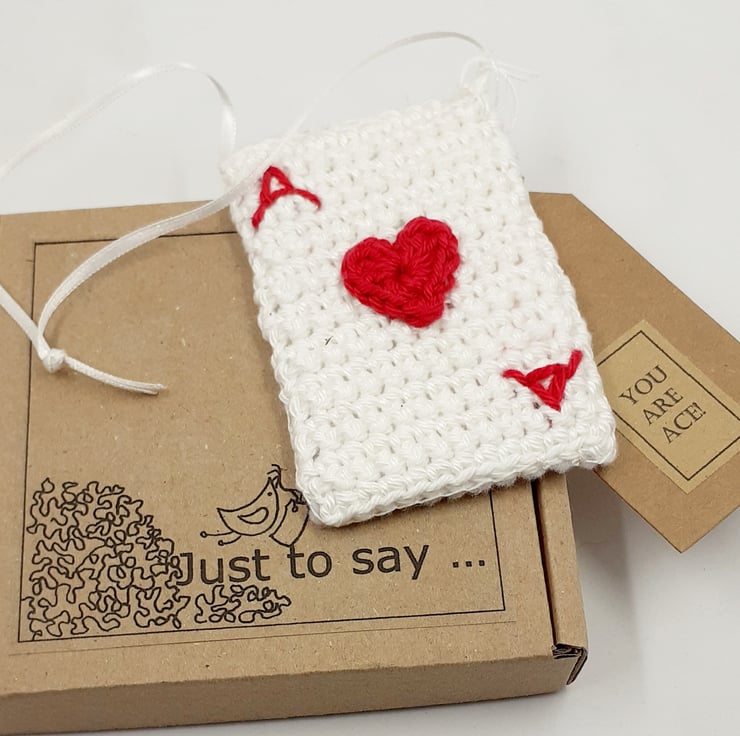 It is crocheted and embroidered in cotton and backed with white craft felt. The card measures approximately 8.5cm by 6cm and has a narrow satin ribbon for a hanging loop. The tag reads You are Ace, although I am very happy to exchange this tag for one with wording of your choice.