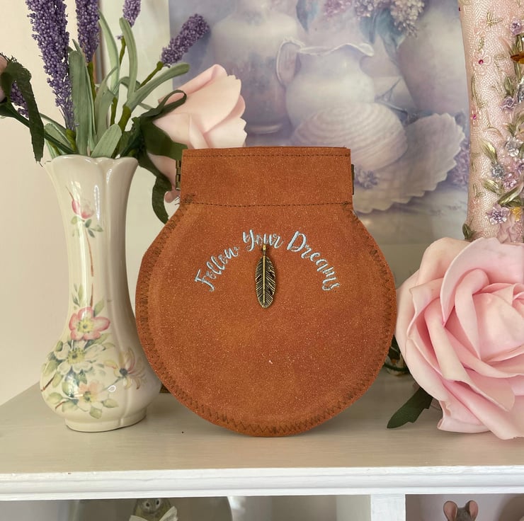 Made from faux leather with a hint of gold. Embroidery design on the front of a dreamcatcher with pretty feathers. Words on the back 'Follow Your Dreams' and a antique brass feather charm. Lined with orange felt. Flexi frame to the top of the purse to keep the contents secure.