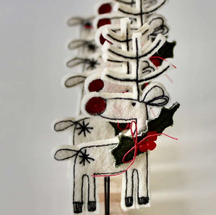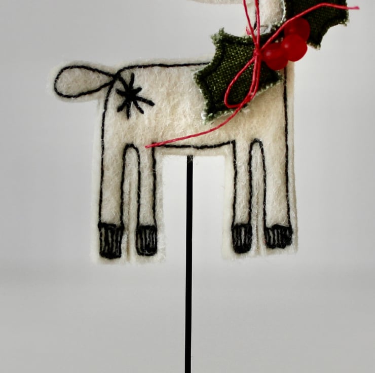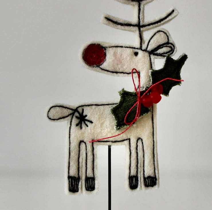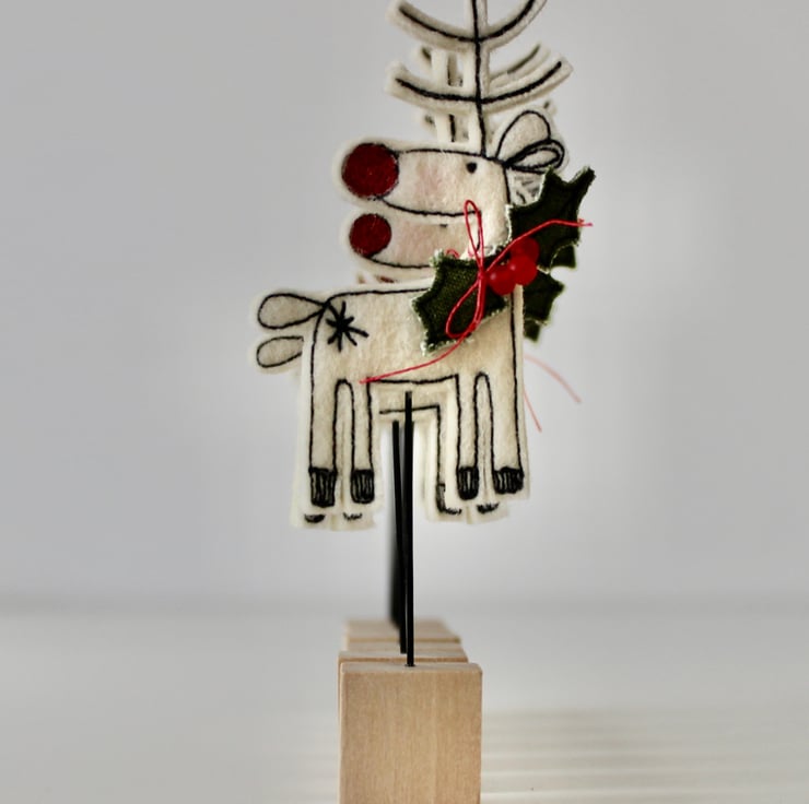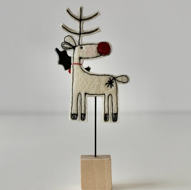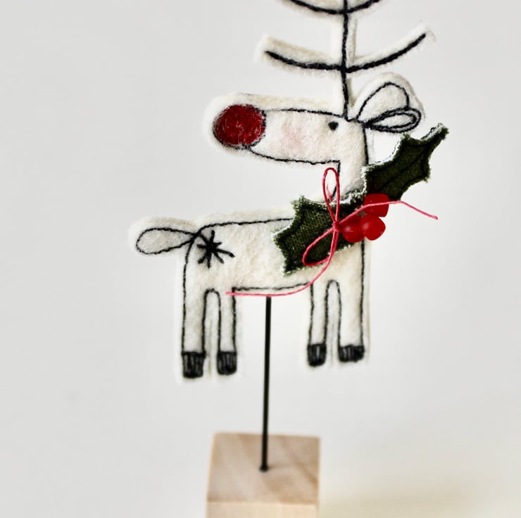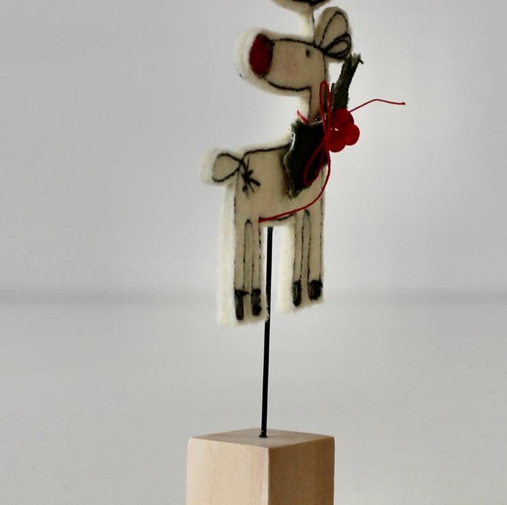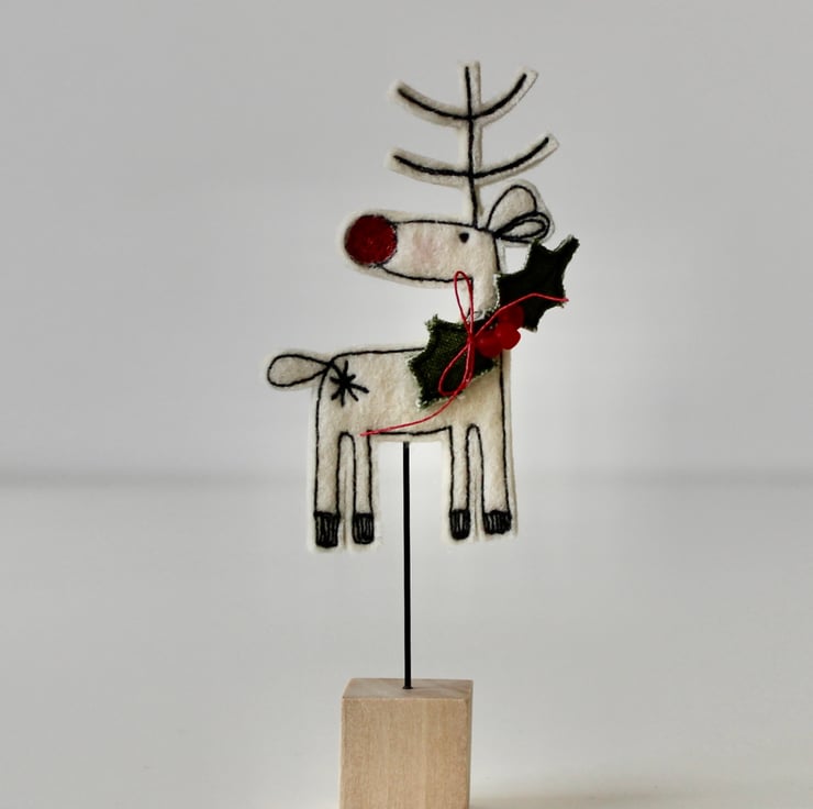 Reindeer is created using 100% wool felt, linen thread, cotton fabric, red glass beads, free hand machine embroidery and is cut out by hand using very sharp scissors. He is mounted on a 2cm cube wooden block, which can adorn a mantle piece or any flat surface.