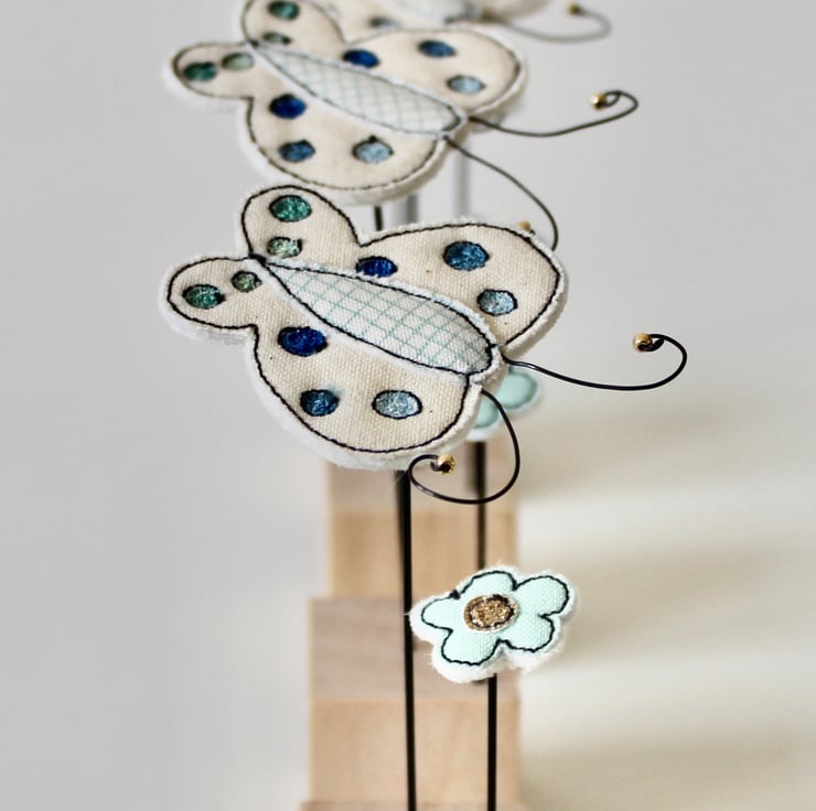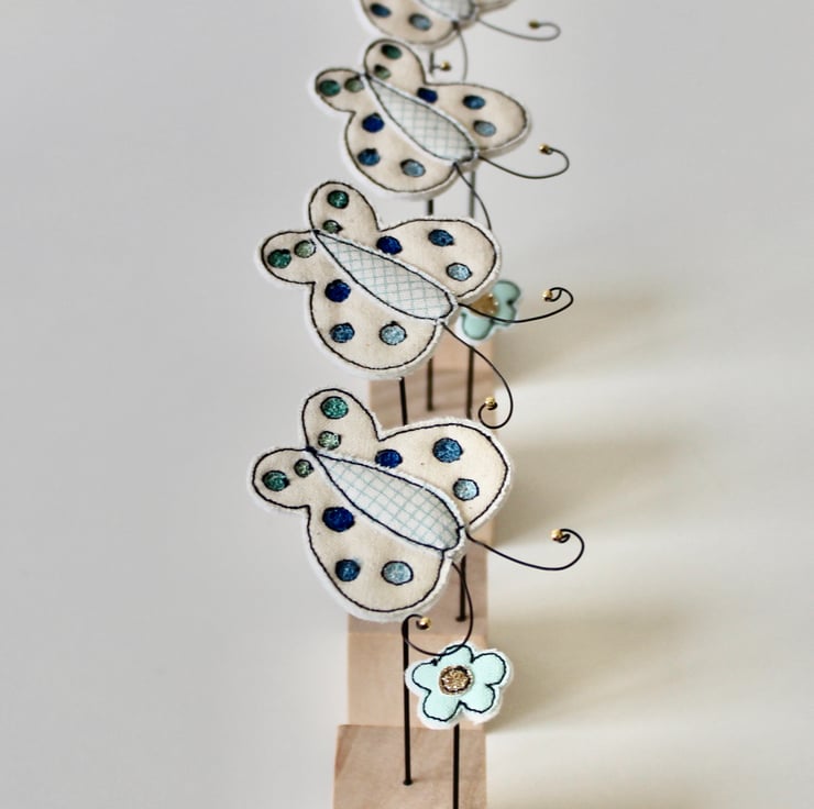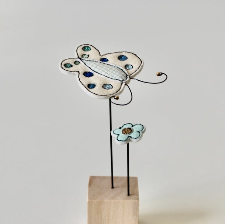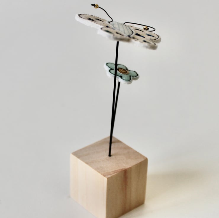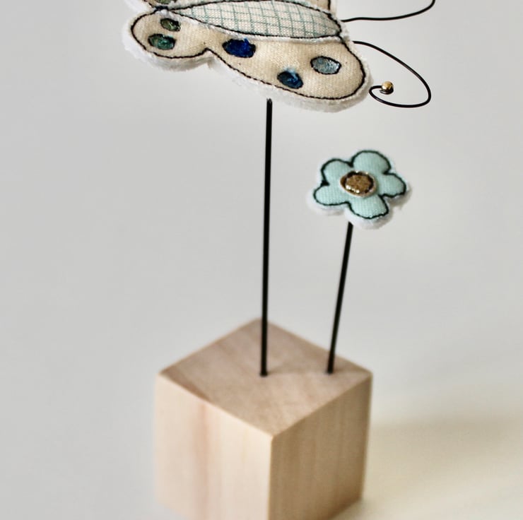 Fluttery butterfly is created using cotton cloth, 100% wool felt, free hand machine embroidery and cut out by hand using very sharp scissors. With wire and gold coloured seed beed antenna; he is mounted on a 3cm cube wooden block, which can adorn a mantle piece or any flat surface.