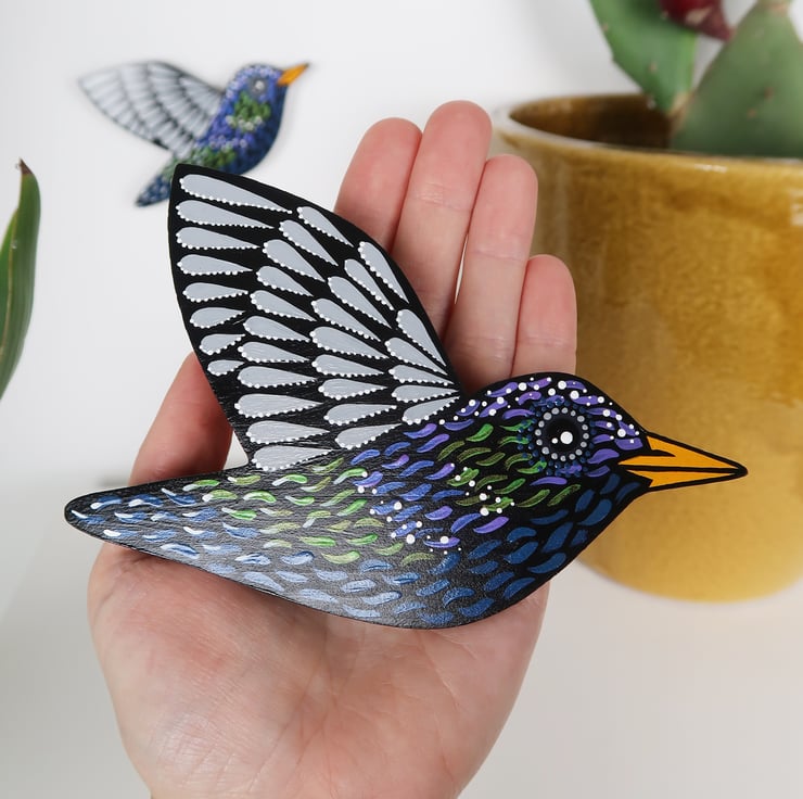 These flying bird ornaments are fully made by hands with love and huge attention to details. Made of pine wood & hand painted with acrylic paints. Varnished - semi gloss finish. Back is clear wood.