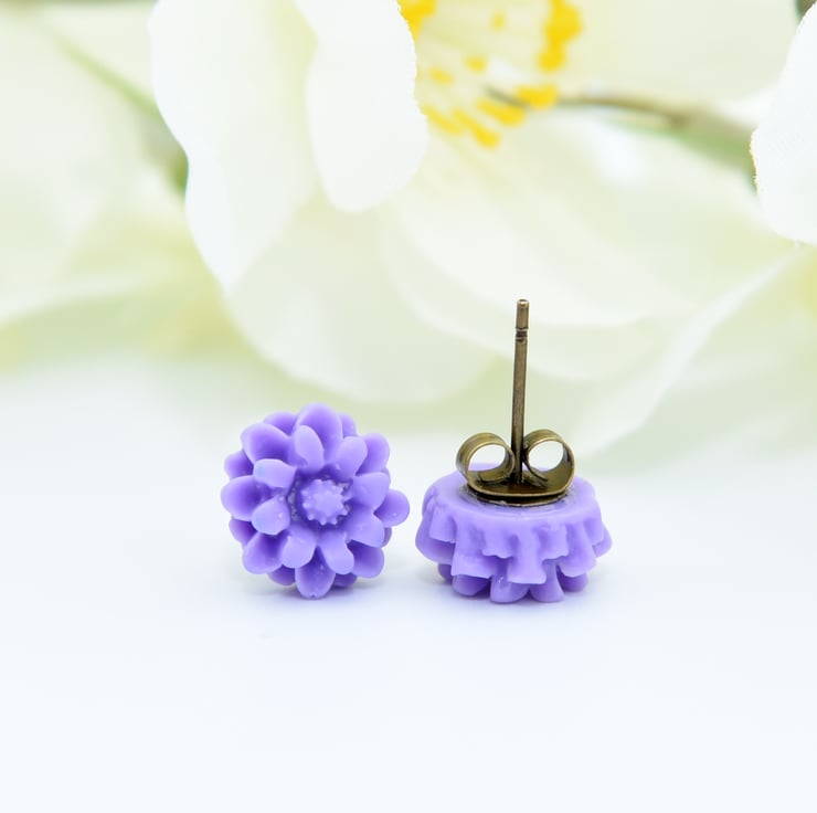 Pretty, vintage-inspired, stud earrings with purple flower cabochons on antique bronze earring blanks and butterfly backs.