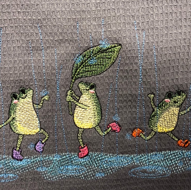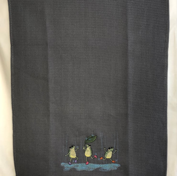 This grey cotton tea towel has an embroidered frog design stitched onto it.