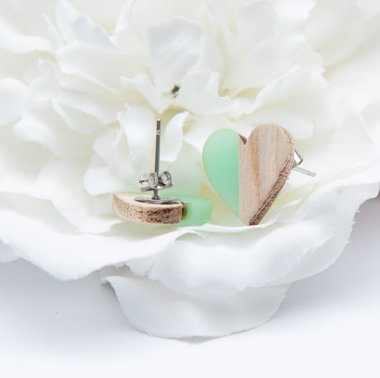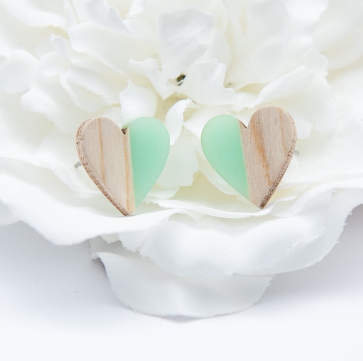 Sweet, heart-shaped stud earrings with spliced pale wood and turquoise resin. These earrings are just so adorable and will brighten up any outfit.