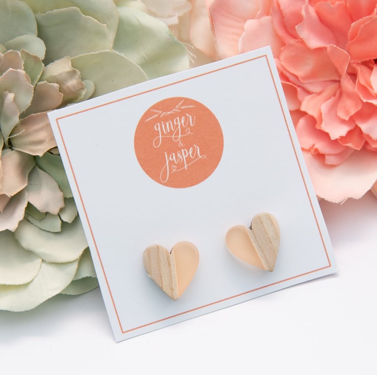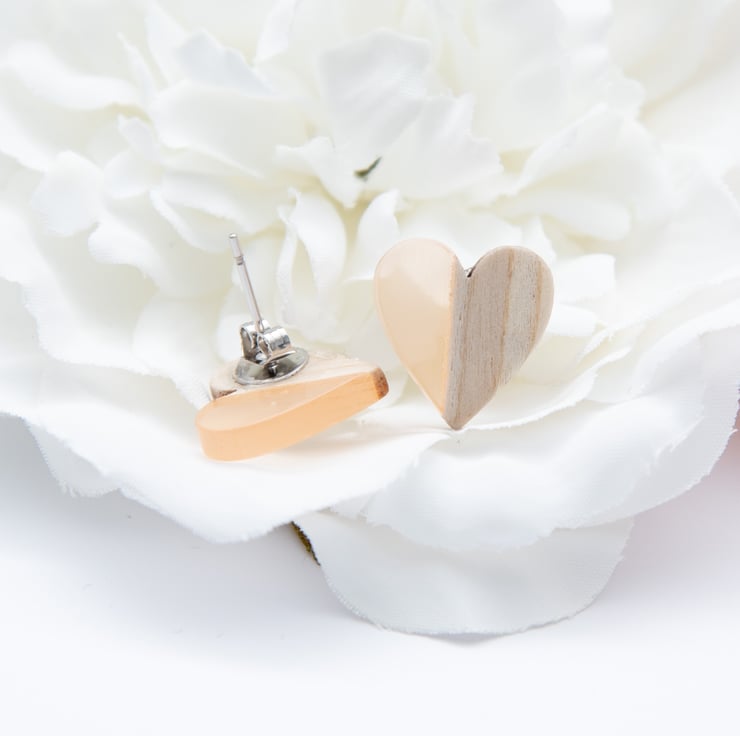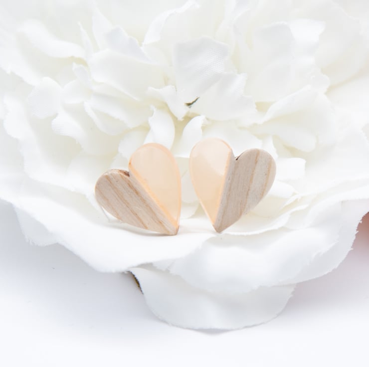 Sweet, heart-shaped stud earrings with spliced pale wood and delicate peach resin. These earrings are just so adorable and will brighten up any outfit.