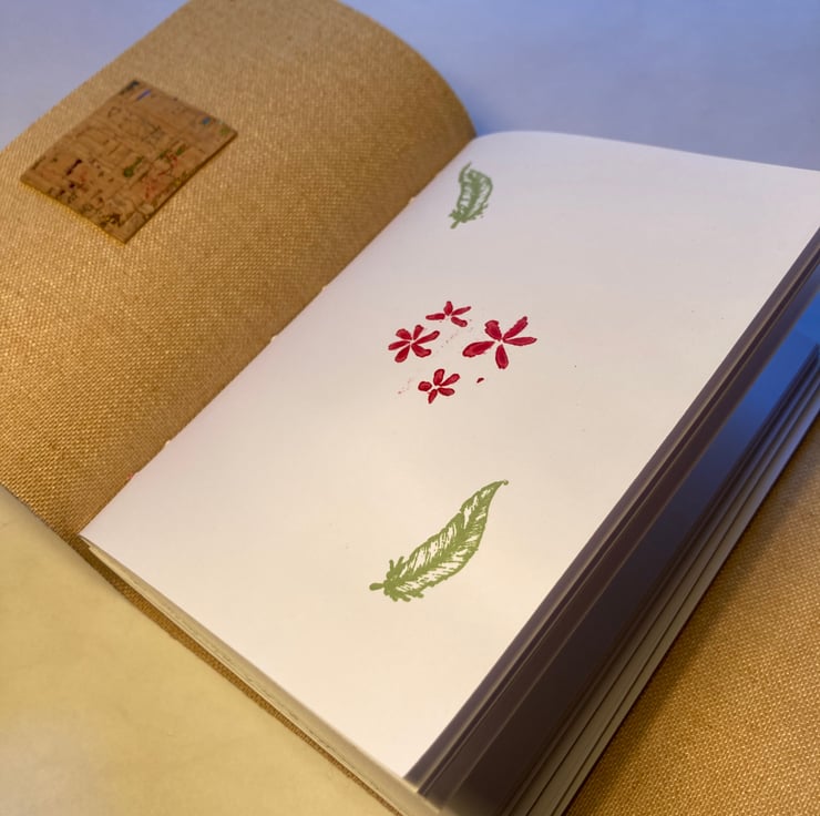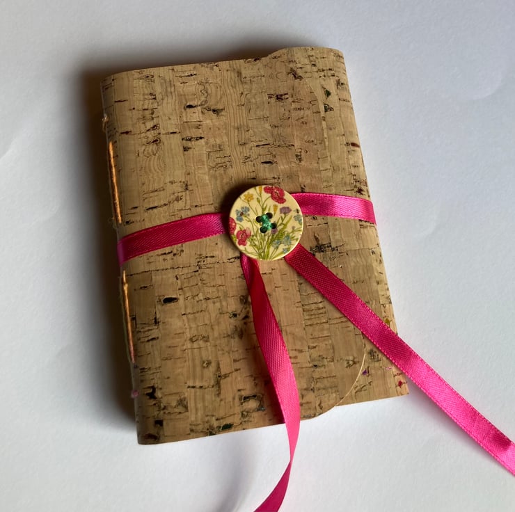 Spring is here and summer is on the way and there can be few things nicer than getting out and about into the countryside observing and recognising wildflowers. This little book could be just what you need to jot down your observations and sketches. It is just the right size to fit into a pocket or handbag and is full of good quality white paper so it is ideal for sketching as well as writing. It is made from soft cork material (vegan leather) in a wraparound style and is fastened witha pink ribbon wrapped around a floral button. The style of binding - longstitch - enables the book to be opened wide and the pages to lie flat.