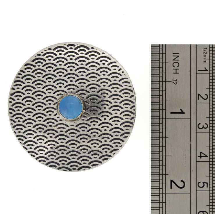 It is made from sterling silver and has a traditional Japanese fan pattern embossed into the surface, it features a lovely 8mm Blue Chalcedony stone and is slightly domed in shape. It measures 45mm in diameter and our maker's mark 'J D F' and a '925' sterling silver mark are stamped on the back.