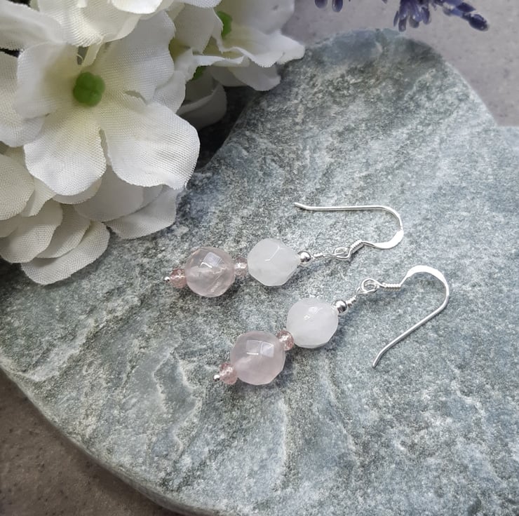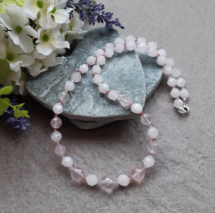Beautiful rose quartz beads with small strawberry quartz spacer beads all being faceted to give a lovely sparkle. The two rose quartz stones used are different, one being almost white in colour make up this necklace and earring set with sterling silver.