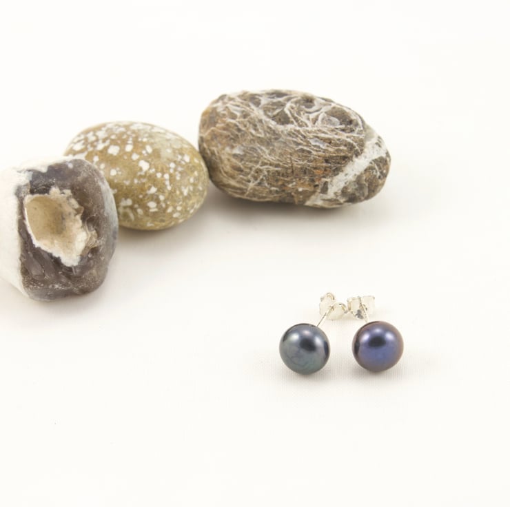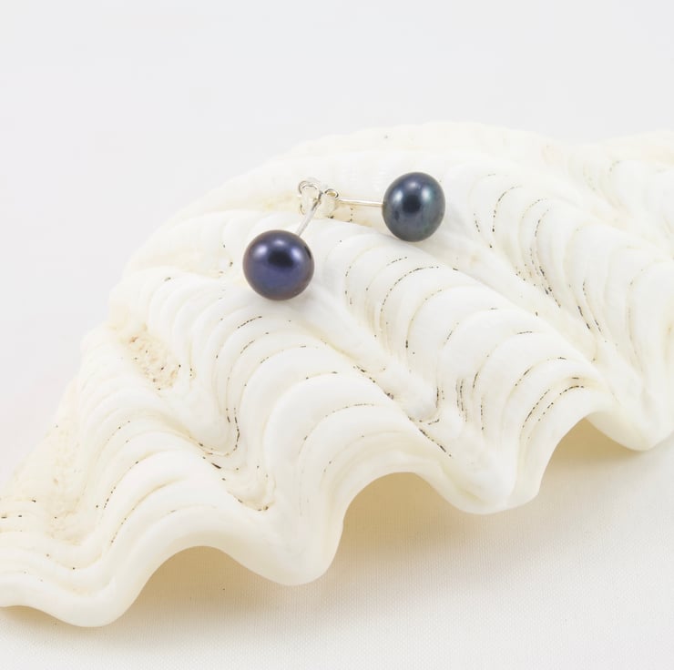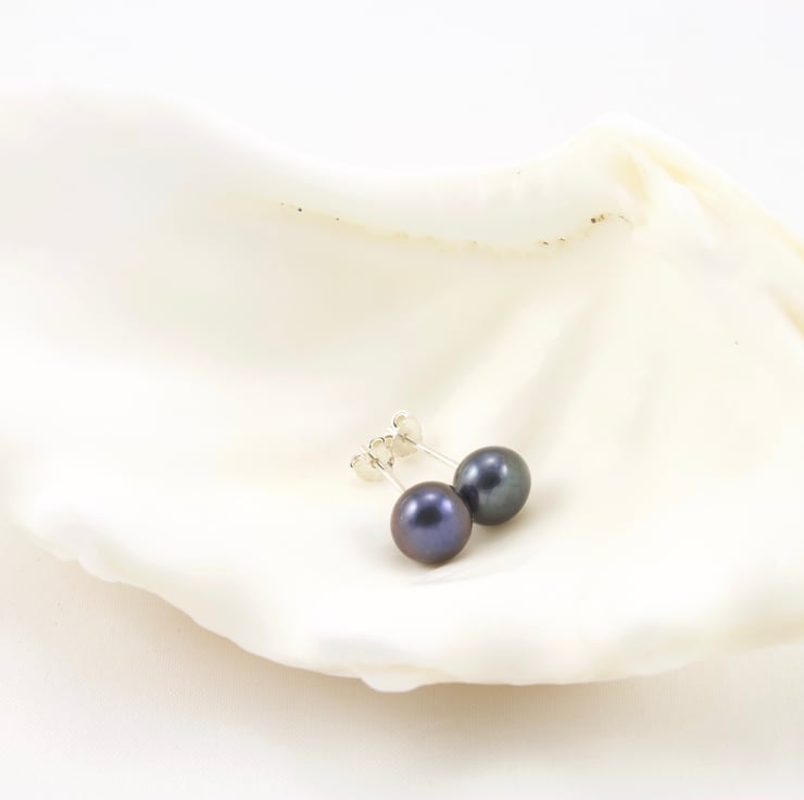 Pretty peacock pearls have hints of blue/green and pink tones in the dark grey colour. They have been set on sterling silver stud ear wires and would make a wonderful addition to your earring collection. The button shape gives an appearance of a larger size without them sticking out too far and makes them a very comfortable choice.