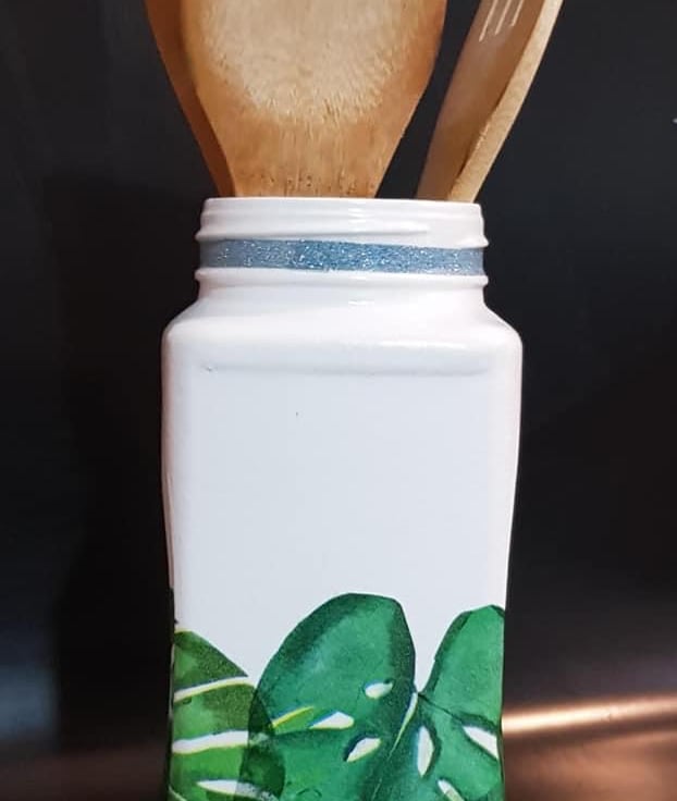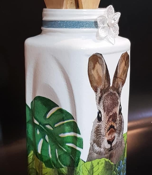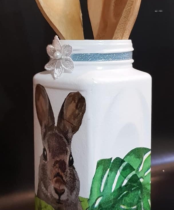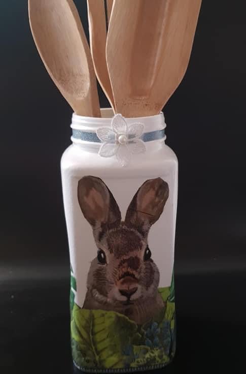 Decoupage rabbit utensil masonry glass jar, With utensils.