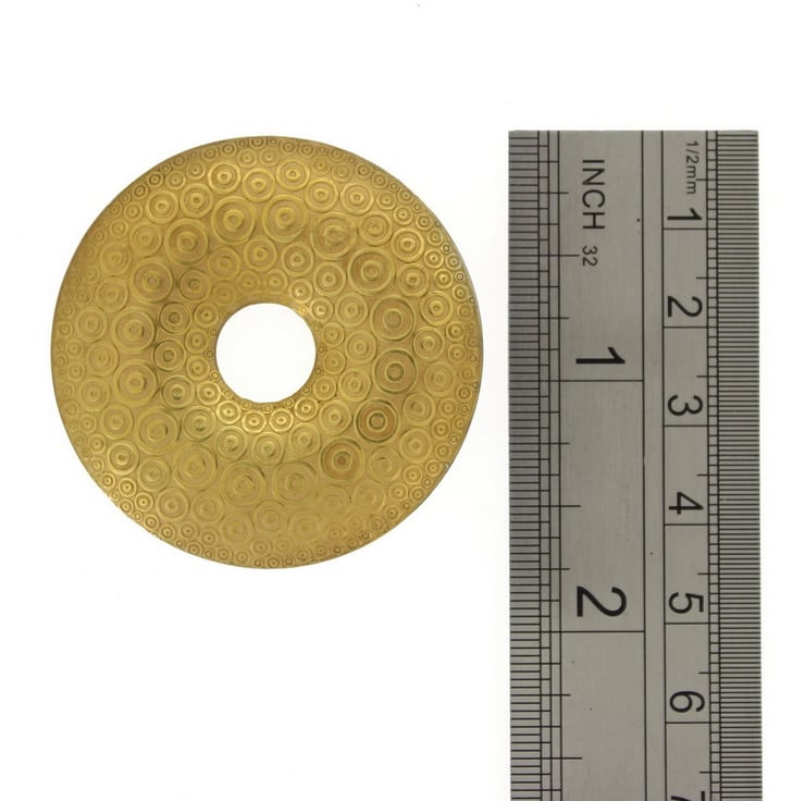 It is made from sterling silver and 24 carat gold plate, it has a slightly domed doughnut shape and it measures 45mm in diameter with the centre hole measuring 10mm in diameter. We designed the circle pattern which has been embossed into the silver to create a beautiful surface pattern.