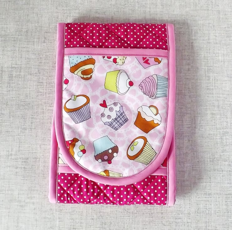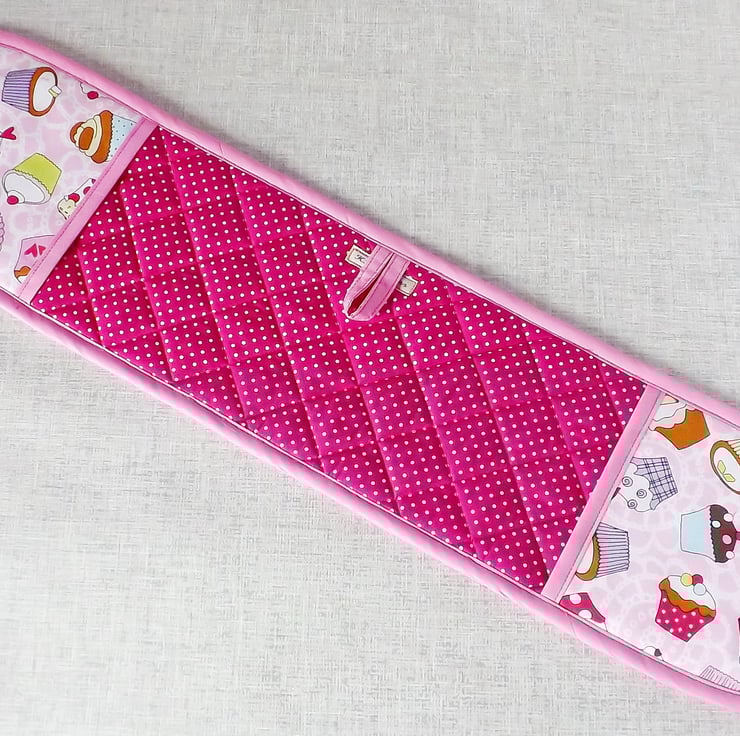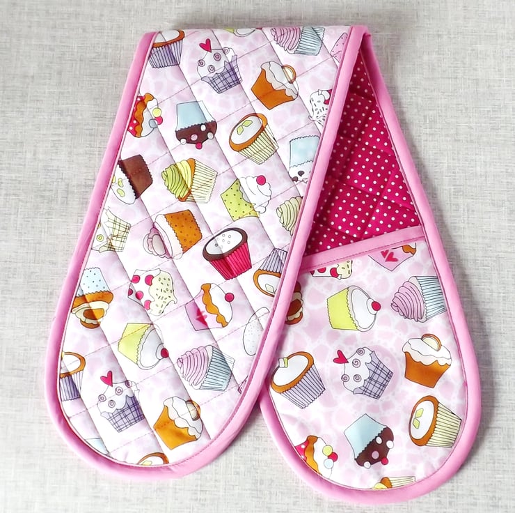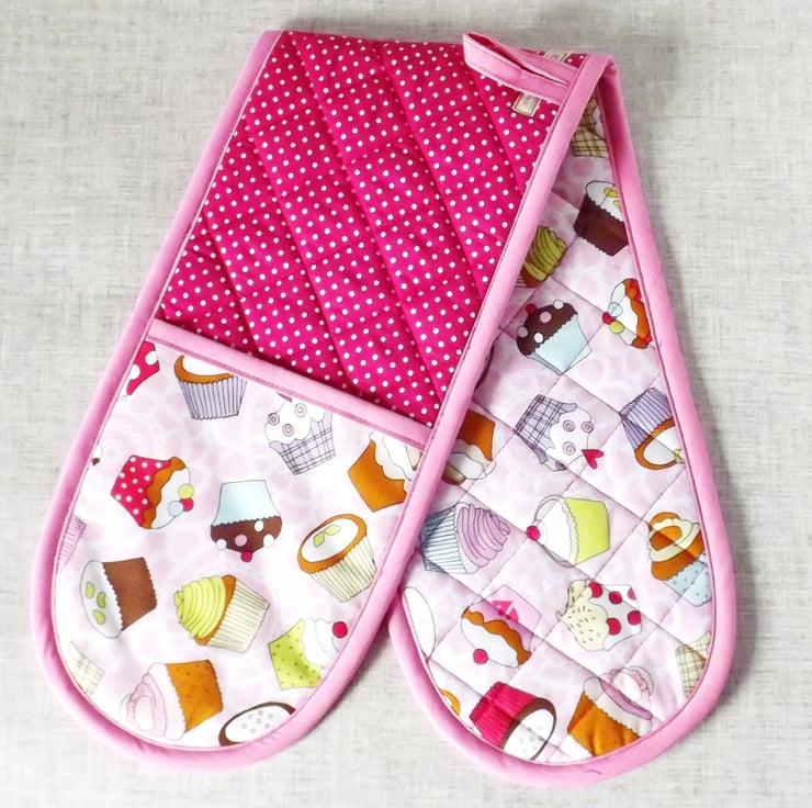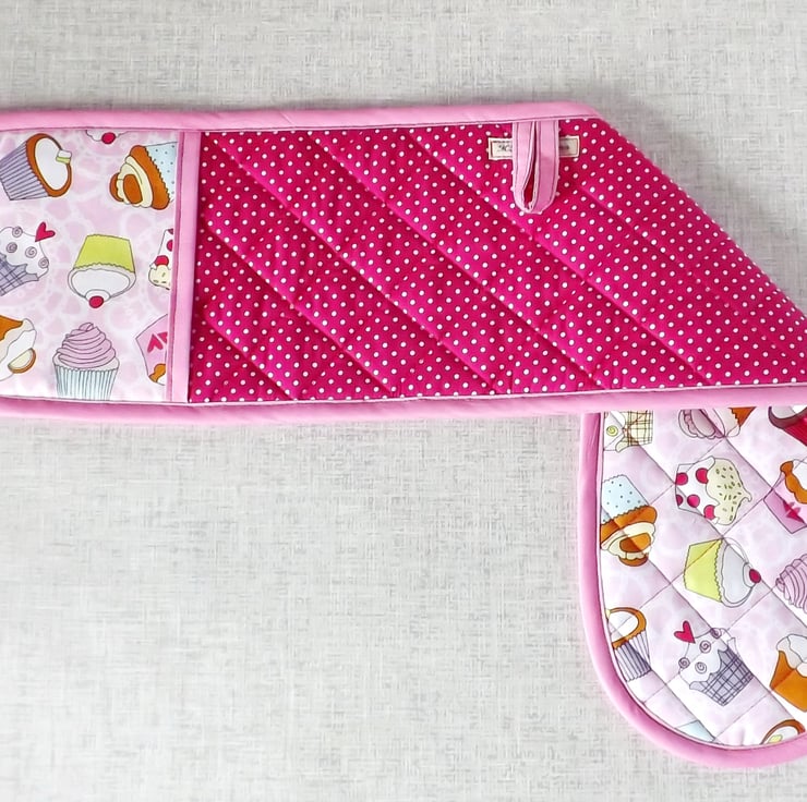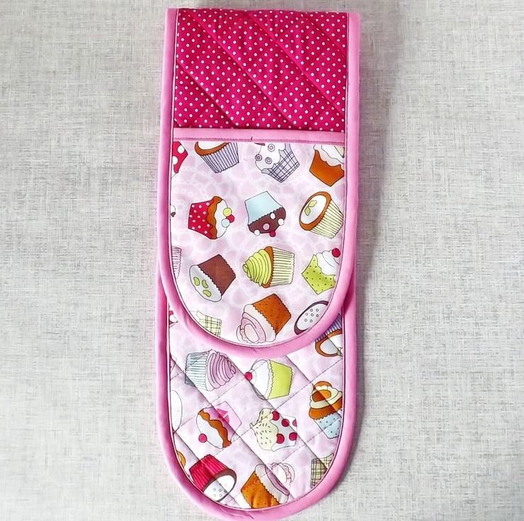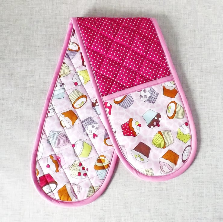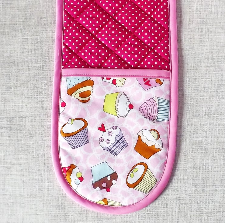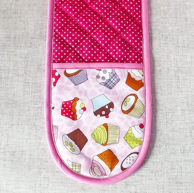 These oven gloves have been made using a lovely cotton fabric with a multicoloured cup cake design on a pink background, combined with a bright pink cotton fabric with white spots on.