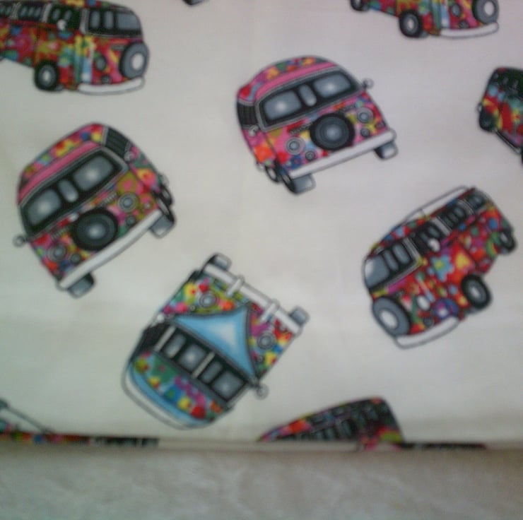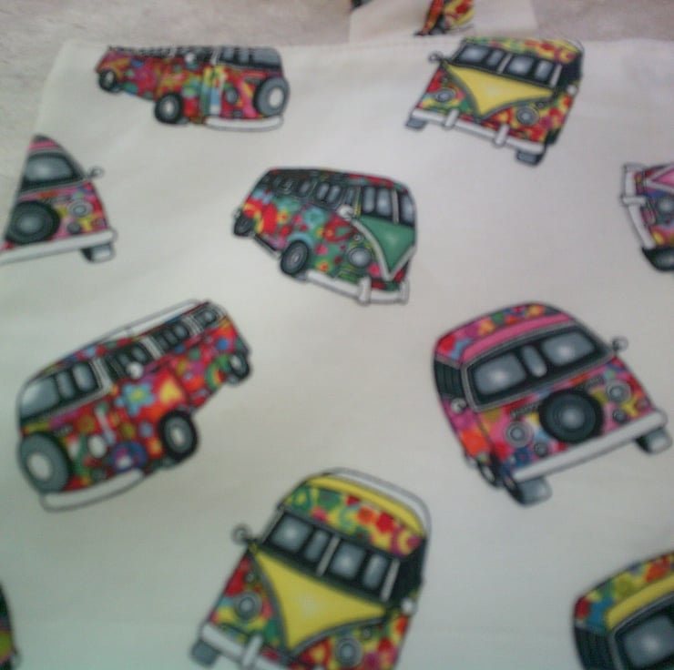 This handy size Eco-friendly shopping bag is made using 100% cotton with colourful VW Camper Vans on a white background. It is lined with a plain cotton fabric.