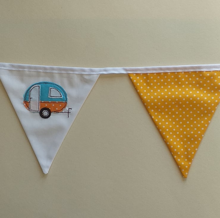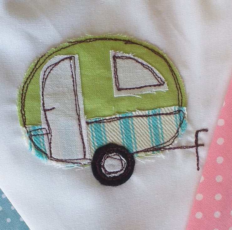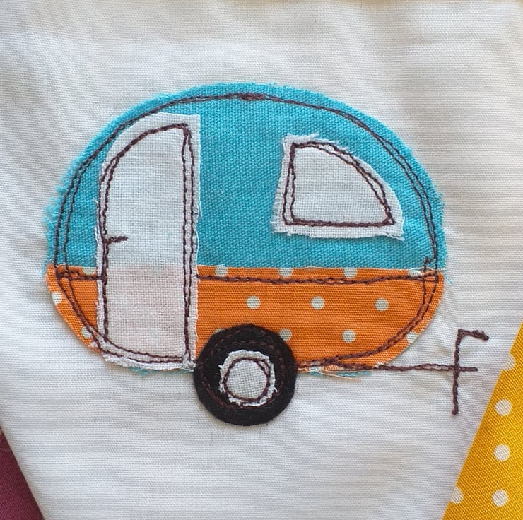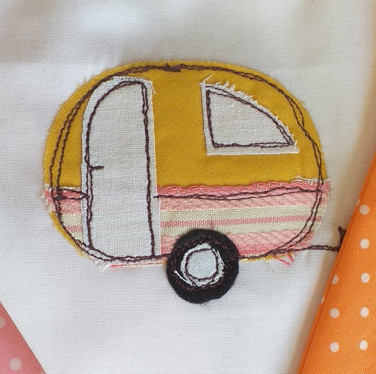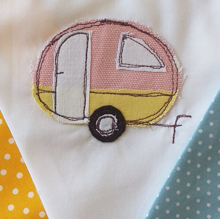This is bright and cheerful bunting featuring caravans made from appliqued fabric scraps and then embroidered using free motion embroidery. The caravans are interspersed with bright spotty fabric. Ideal for hanging over a fireplace, in a caravan, tent or treehouse. A perfect present for a camping or caravaning friend.