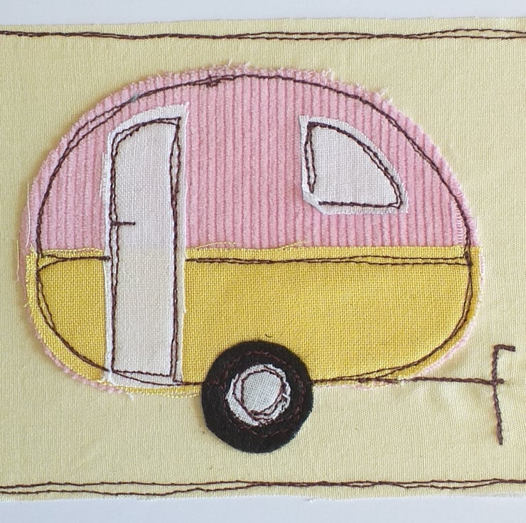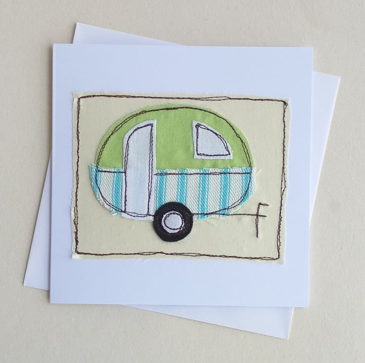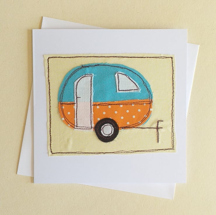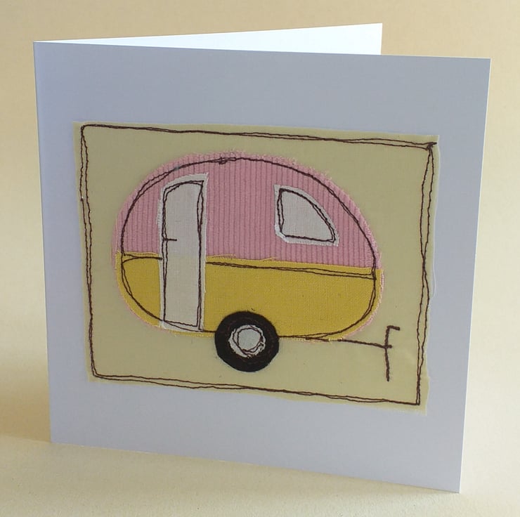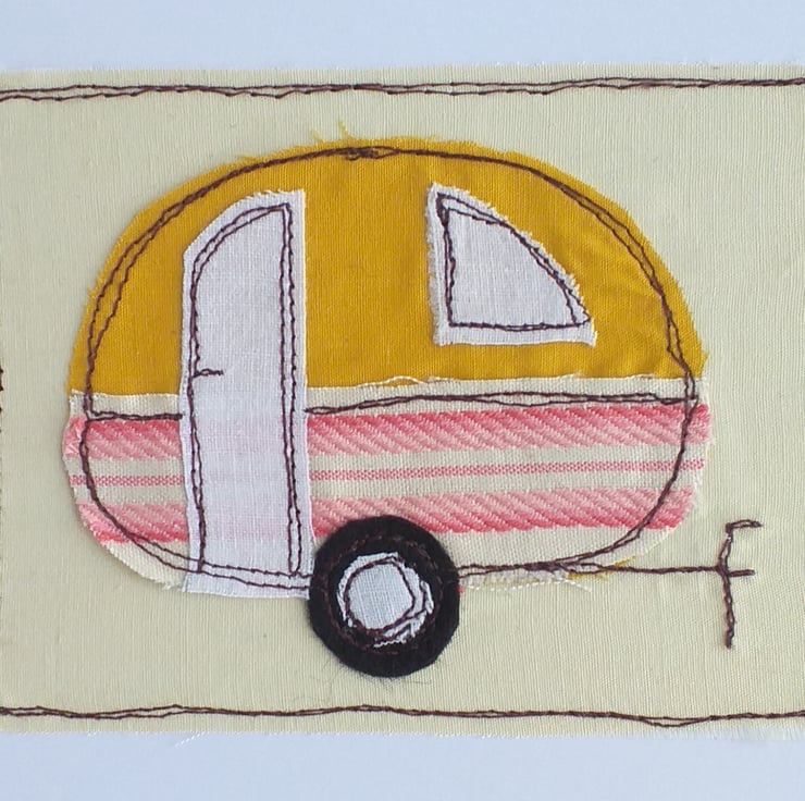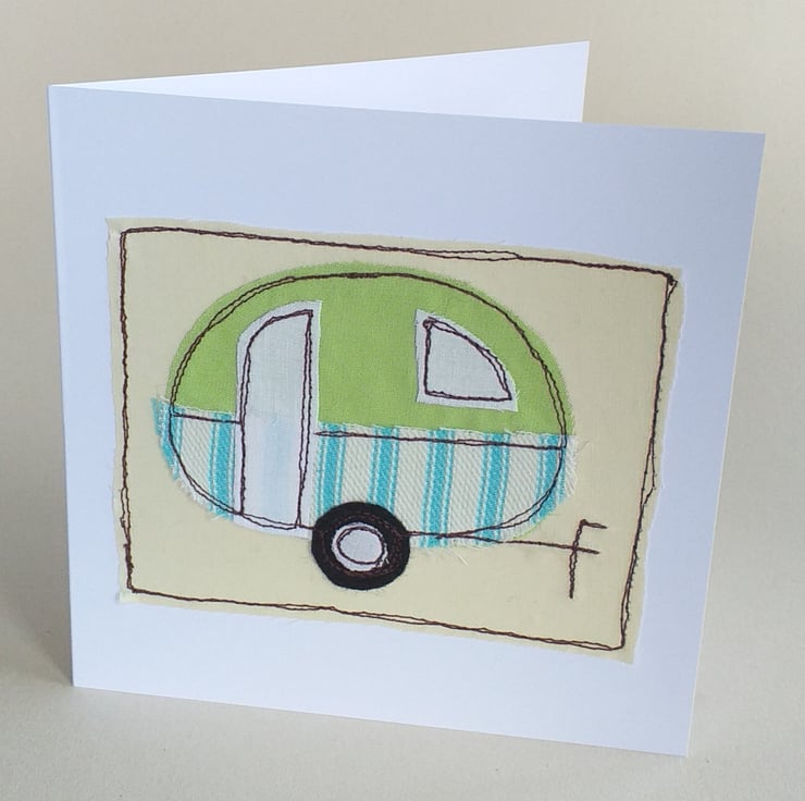 This is a greeting card featuring a caravan made from appliqued fabric scraps embroidered with free motion embroidery. The fabrics and colours will vary but if you would like to specify colours, there is an option to do that.