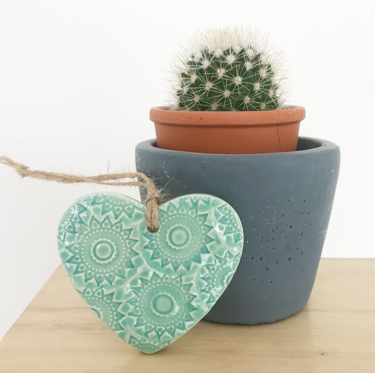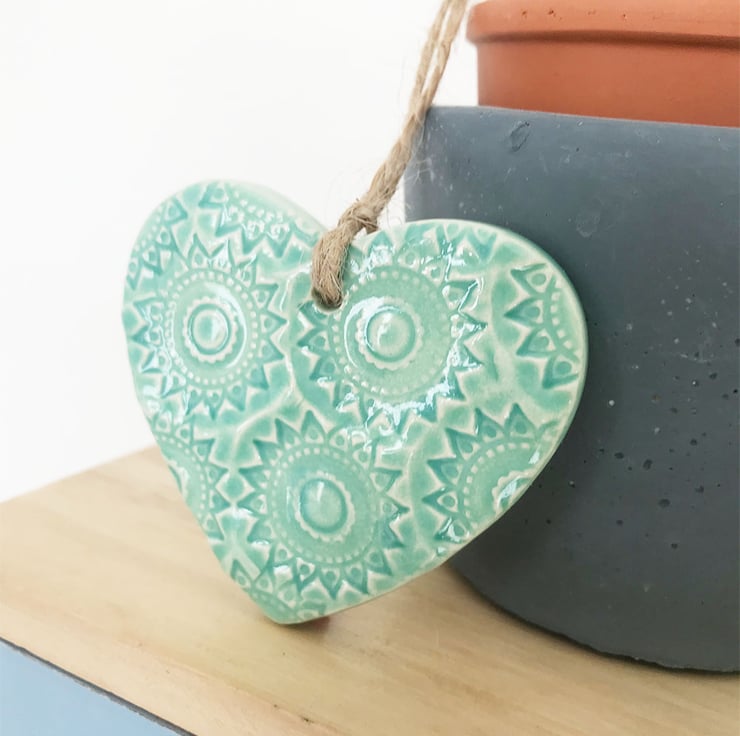 This little heart is made from white earthenware clay, imprinted with pattern and finished with a bright, glossy glaze. It has been fired twice, once to the bisque stage and then a second firing for the glaze. It measures 6 centimetres wide x 5.5cm height x 5mm thick. It can be hung outside.