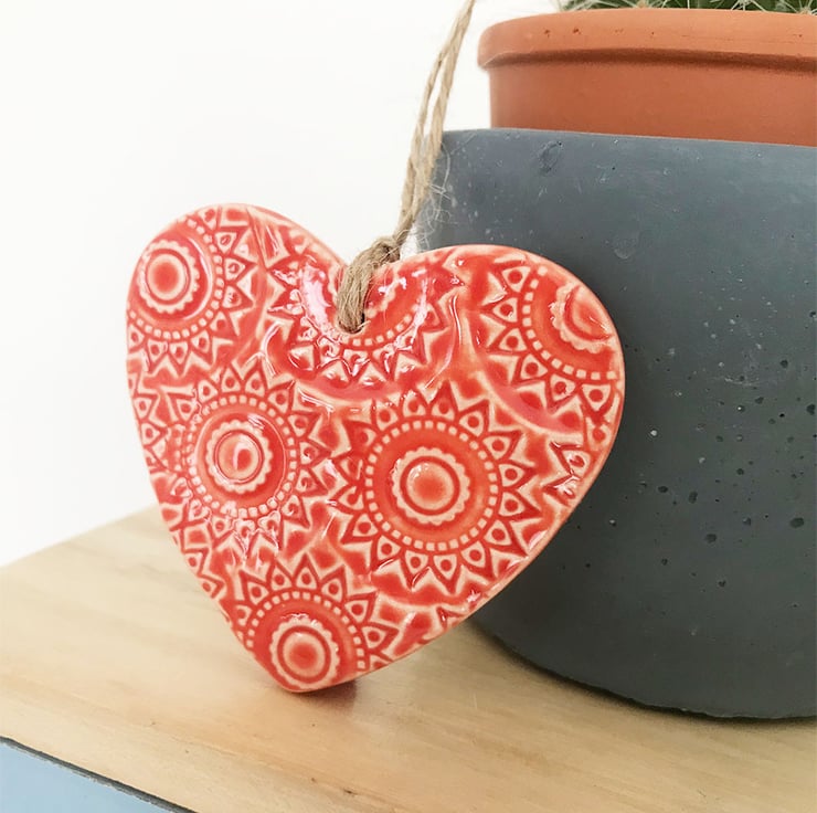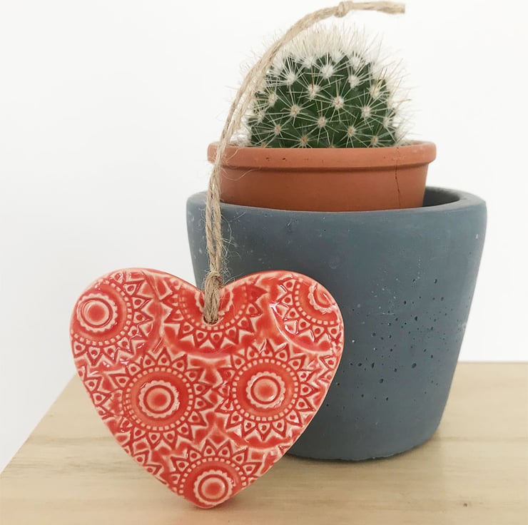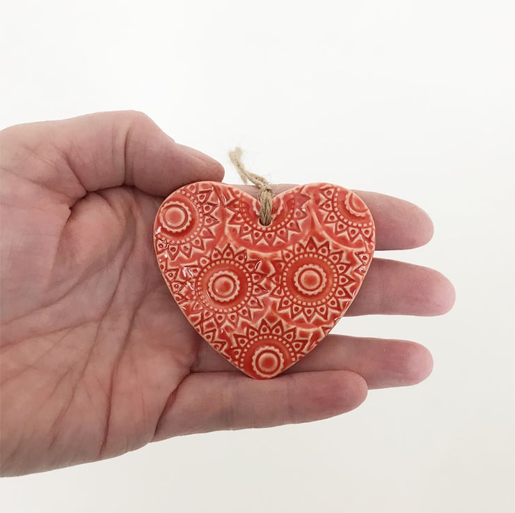 This little heart is made from white earthenware clay, imprinted with pattern and finished with a bright, glossy glaze. It has been fired twice, once to the bisque stage and then a second firing for the glaze. It measures 6 centimetres wide x 5.5cm height x 5mm thick. It can be hung outside.