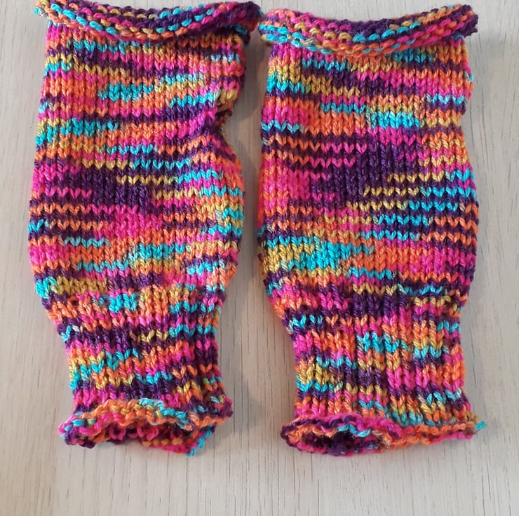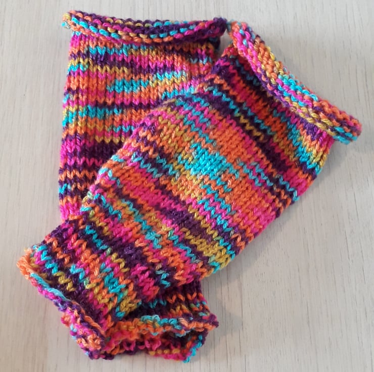 These rainbow wristwarmers are sure to brighten up your day! They have been lovingly made on a domestic, hand operated knitting machine and feature a ribbed cuff and rolled top. They have plenty of stretch to fit most hands.