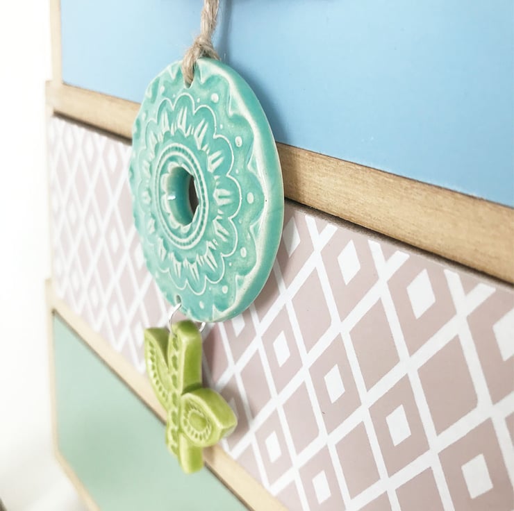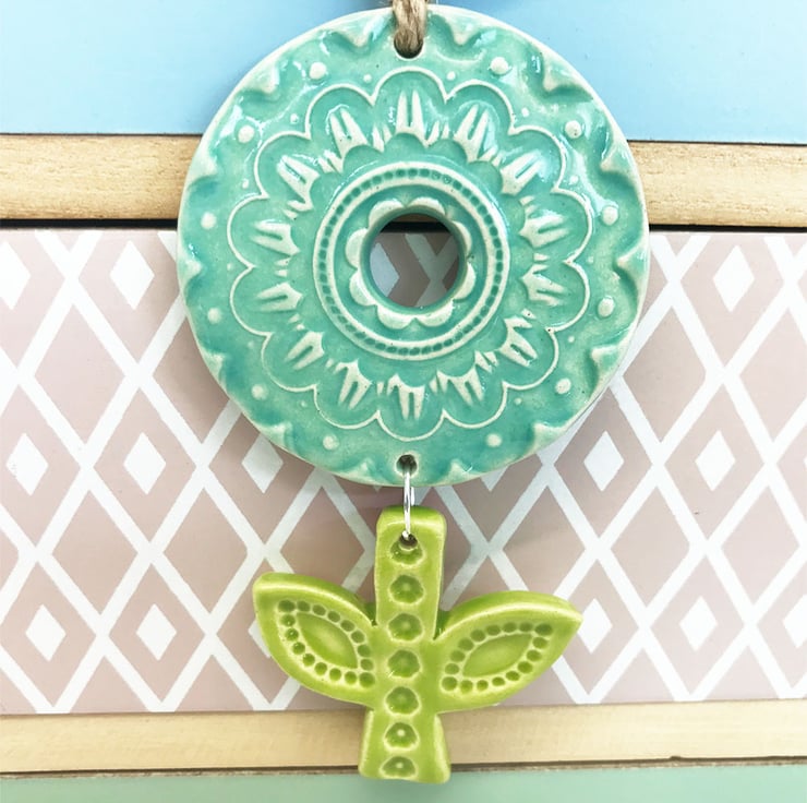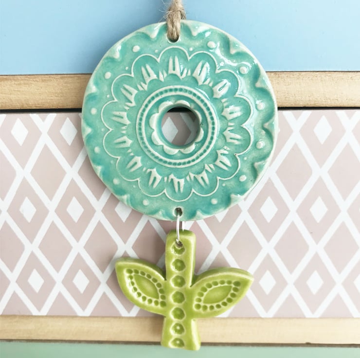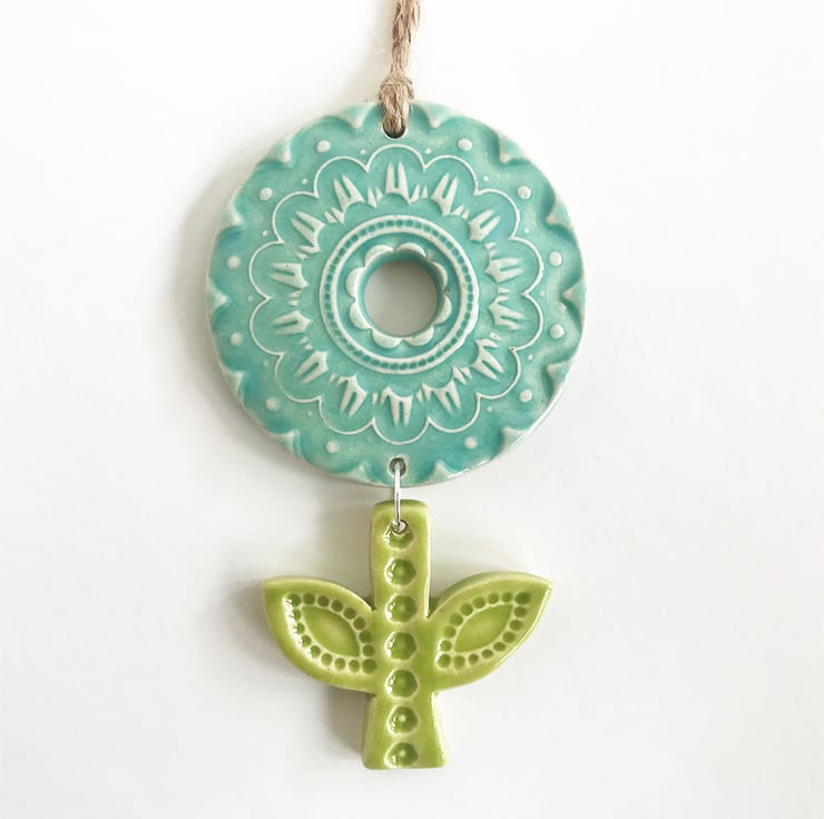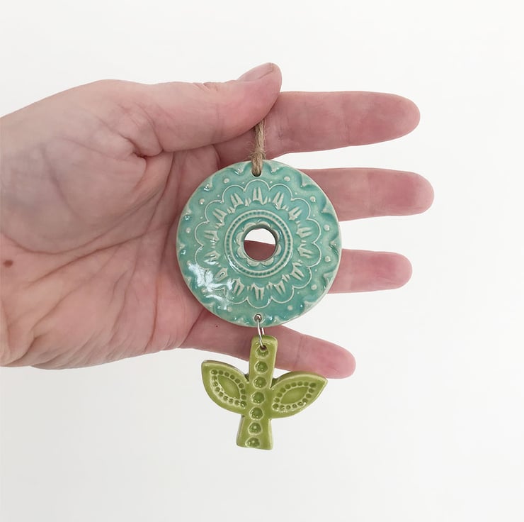 This flower deoration is made from white earthenware clay, imprinted with pattern and finished with a bright, glossy glaze. It has been fired twice, once to the bisque stage and then a second firing for the glaze. It measures 10 centimetres high x 5.5cm wide x 5mm thick.
