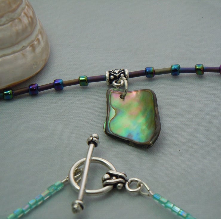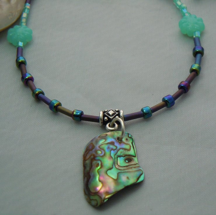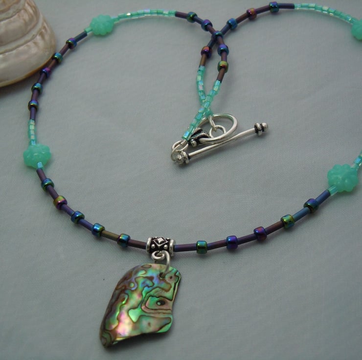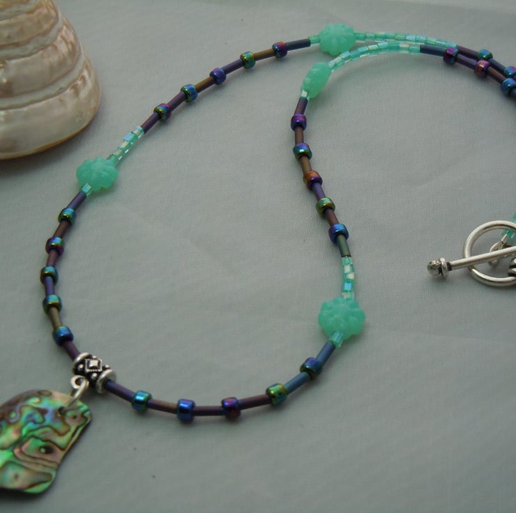 A necklace pendant with a beautiful double sided freeform Abalone shell pendant showing a mosaic of colours & threaded with Czech glass green flower beads, iridescent seed beads, bugle beads & finished with a silver plate toggle clasp. A reminder of holidays by the sea collecting shells.