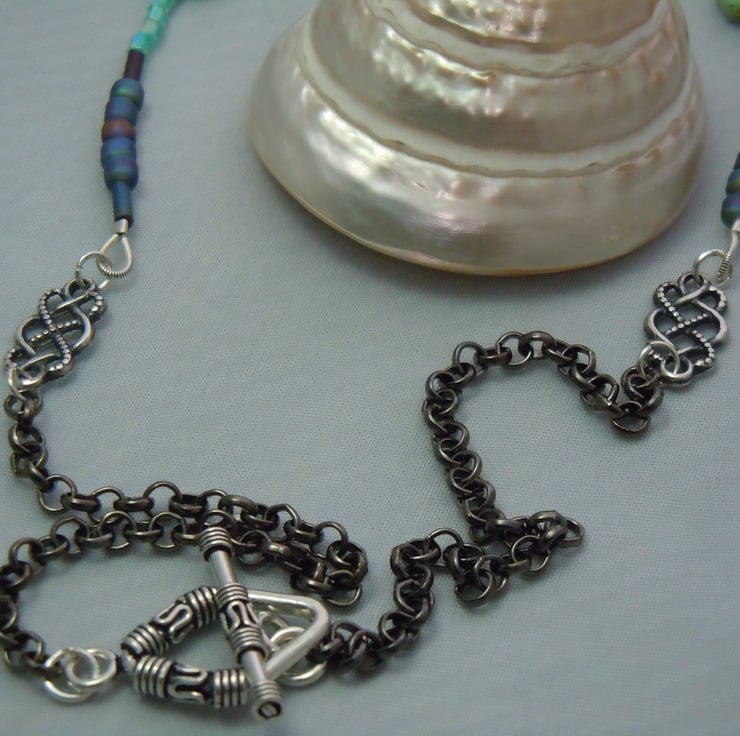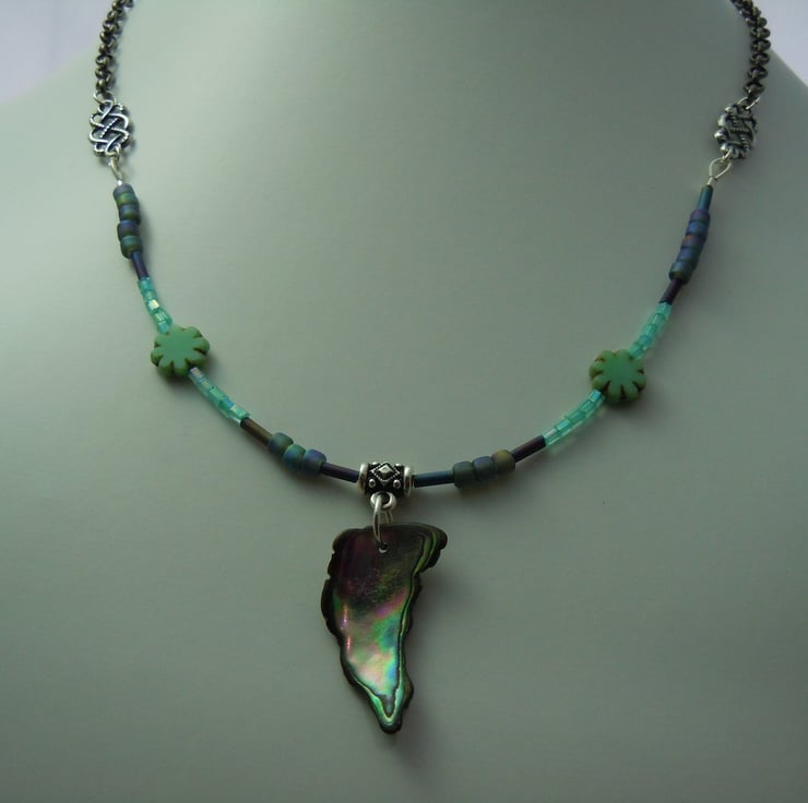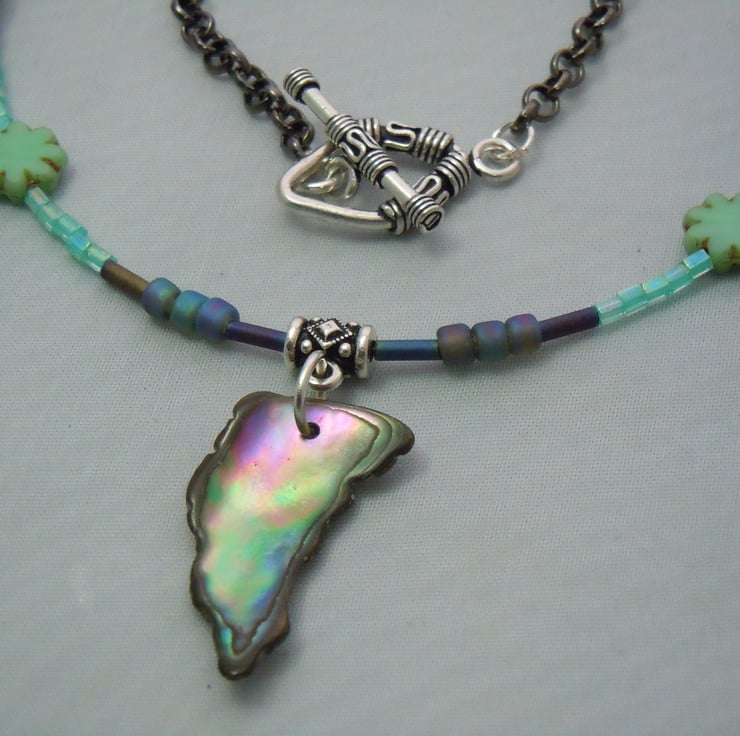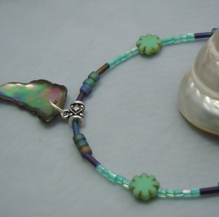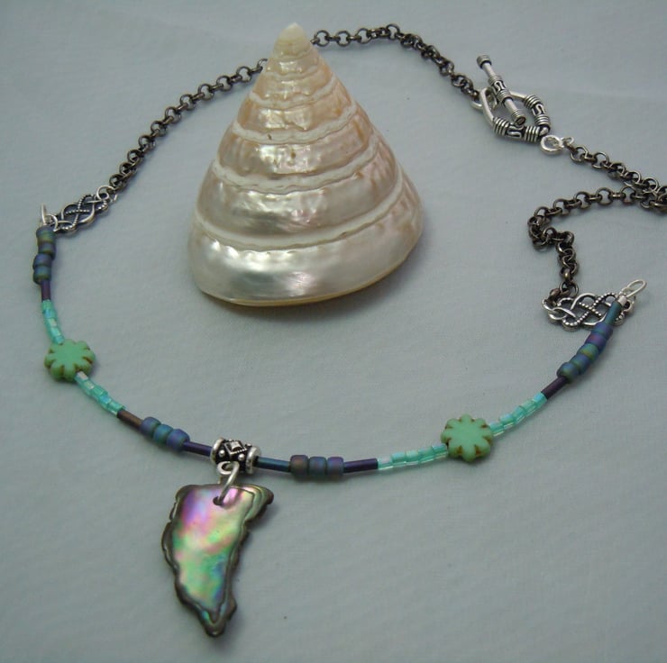 A necklace pendant with a freeform Abalone shell pendant, threaded with Czech glass table cut beads, iridescent seed & bugle beads attached with antique silver plate connectors to a black colour metal chain & finished with a silver plate toggle clasp. Inspired by the sea, beach holidays & beachcombing looking for shell treasures.