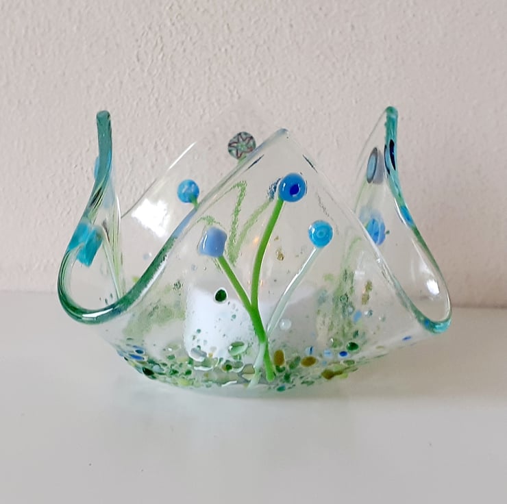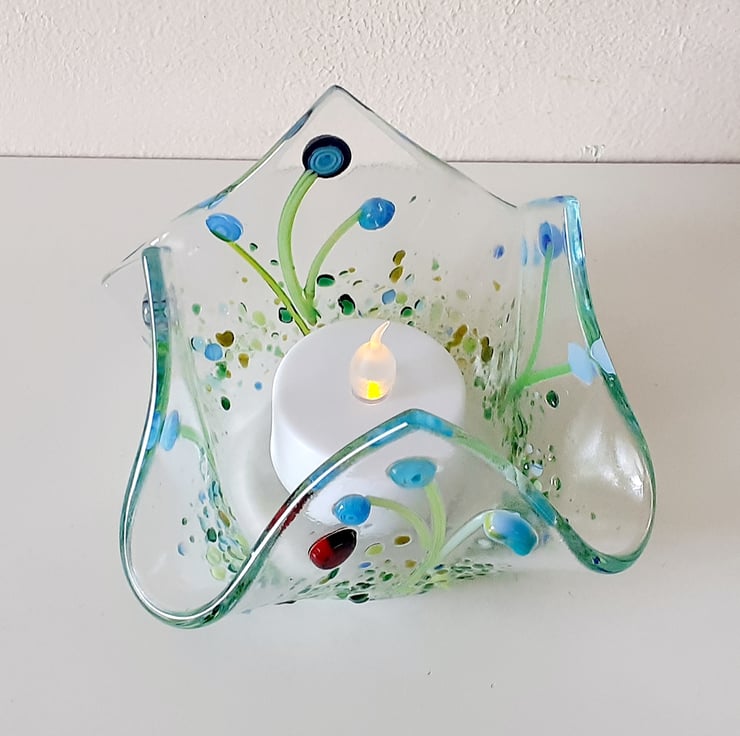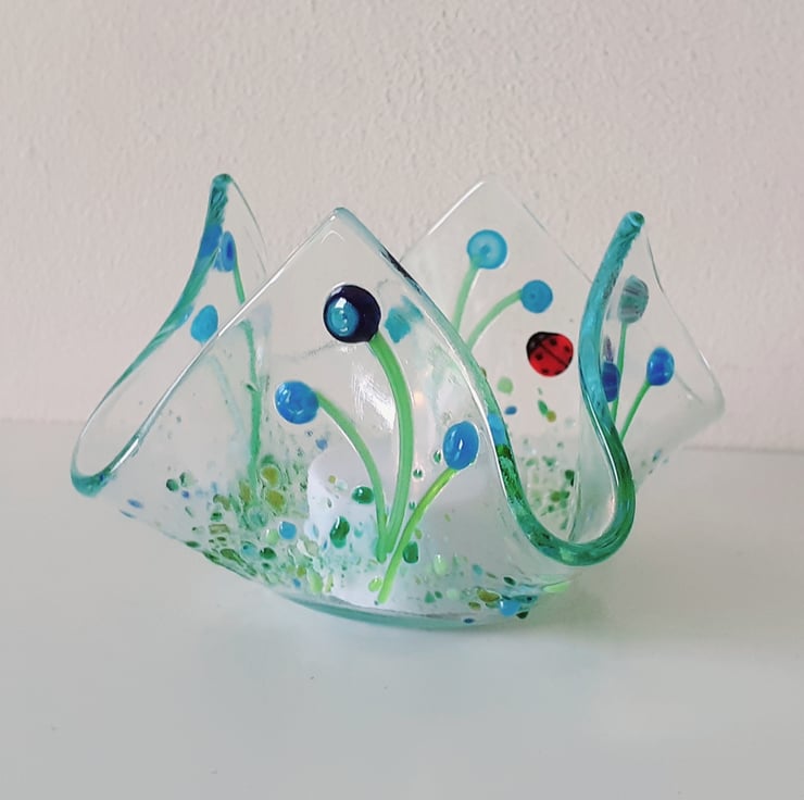 Delicate fused glass tea light or candle holder, decorated with textured glass stems and pretty blue flowers. A tiny ladybird sits in one corner of the glass.