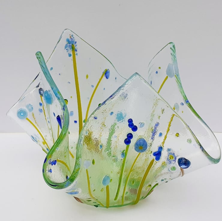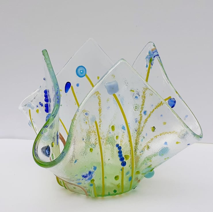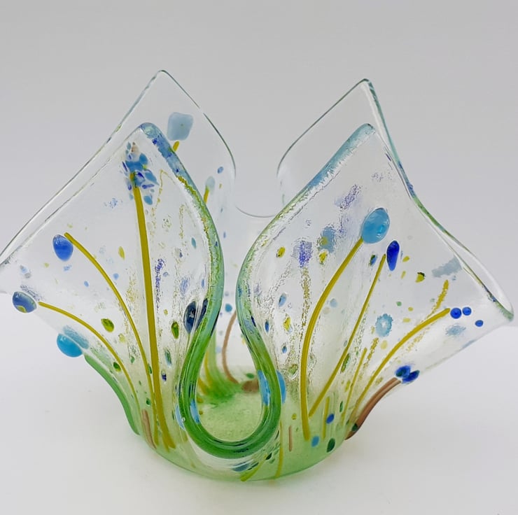 Delicate fused glass tea light or candle holder, decorated with textured glass stems and pretty blue flowers.