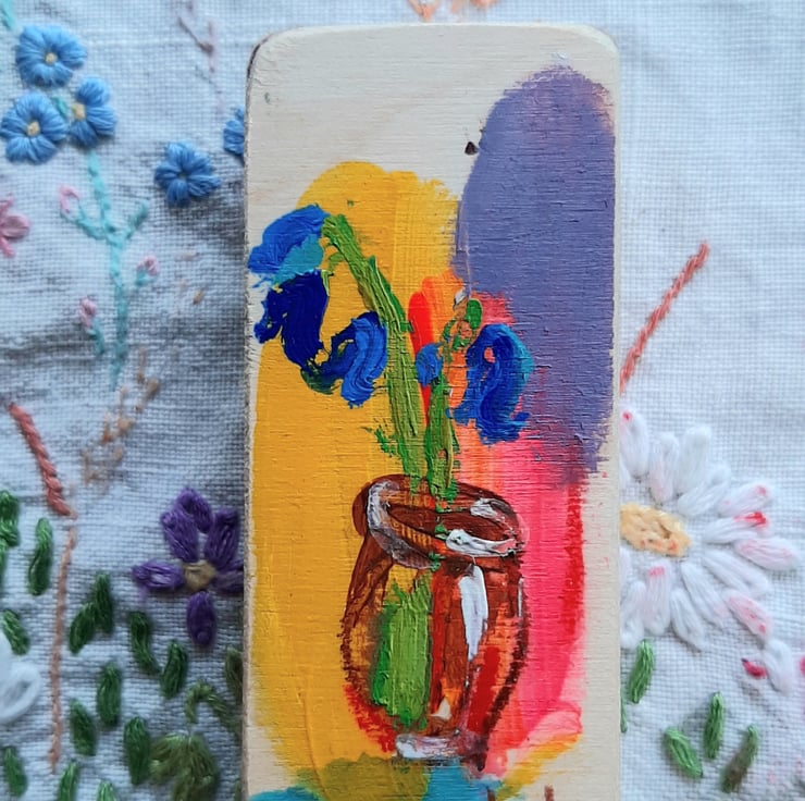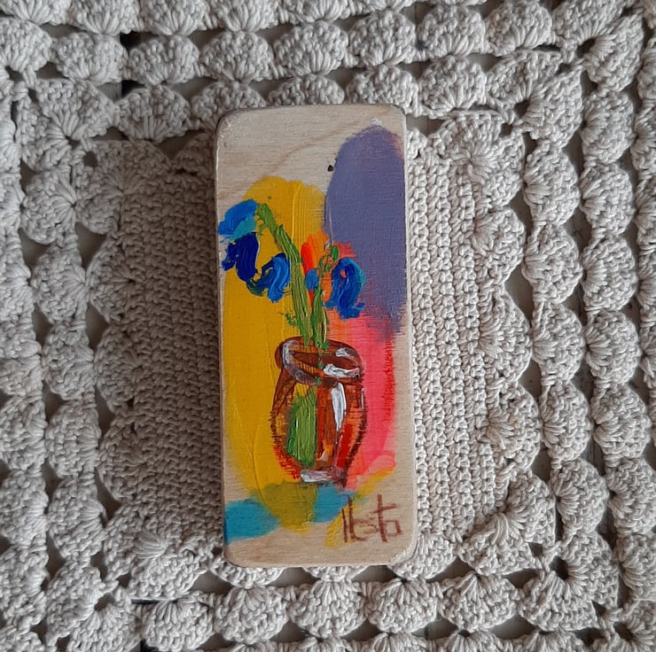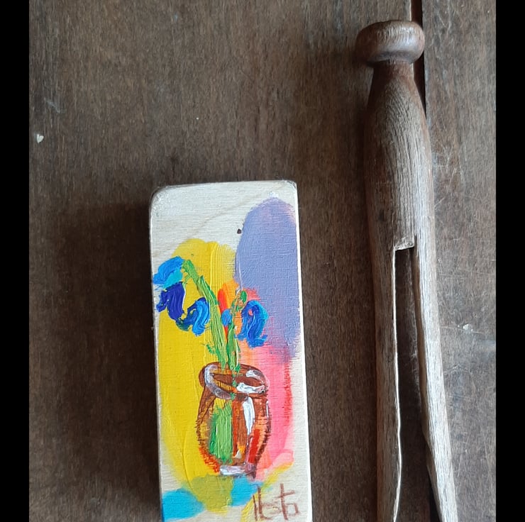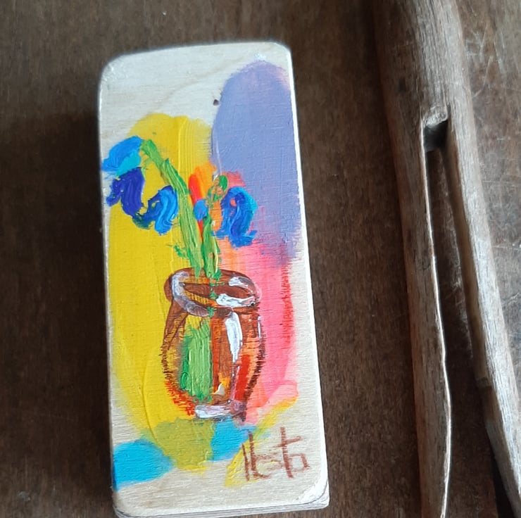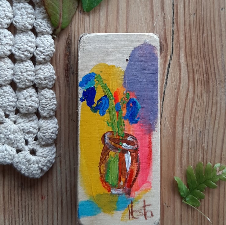 Small and sweet painted on thick 2cm deep reclaimed wood. Sanded, signed, lightly varnished and ready to hang. By artist Hesta singlewood aka bodkincreates on Instagram. Simple bright and cheerful miniature 8 cm tall.