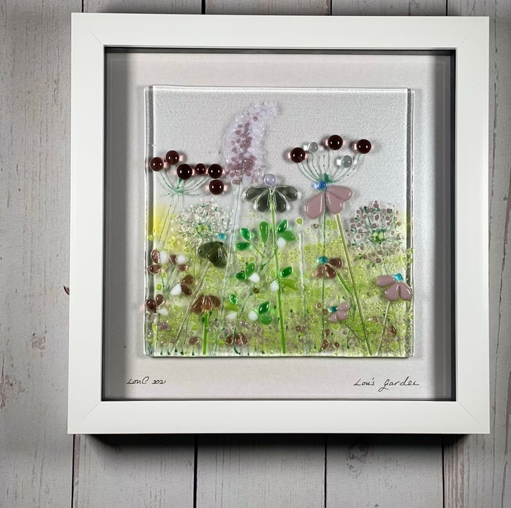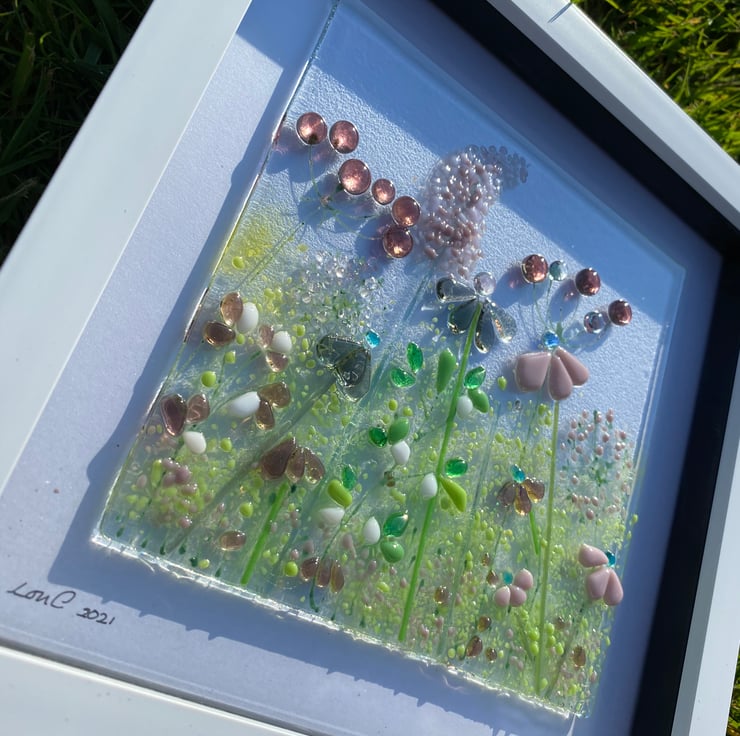 Constructed over a few firings these gorgeous one of a kind fused glass pictures will add interest, light and texture to any home. The colours of pink, blue and lilac make this meadows picture very pretty.