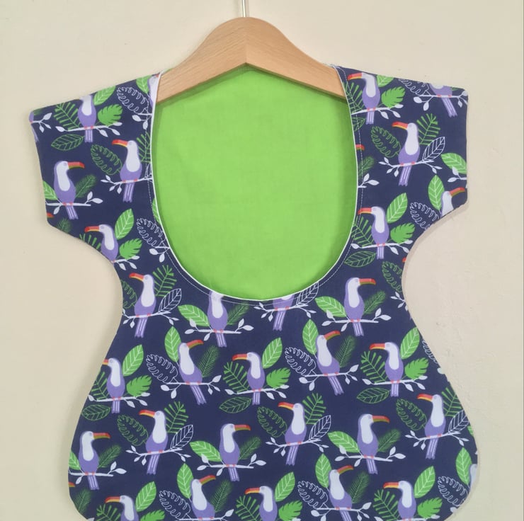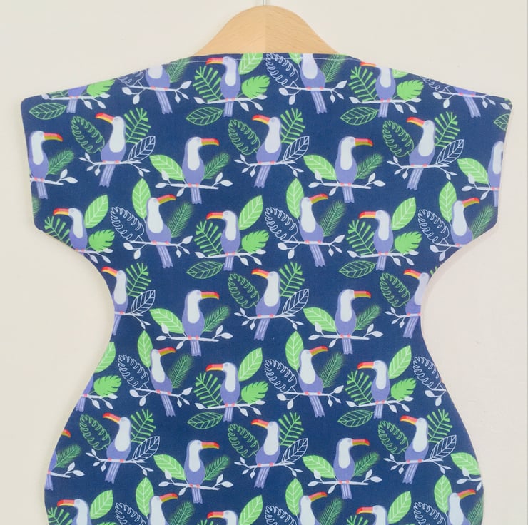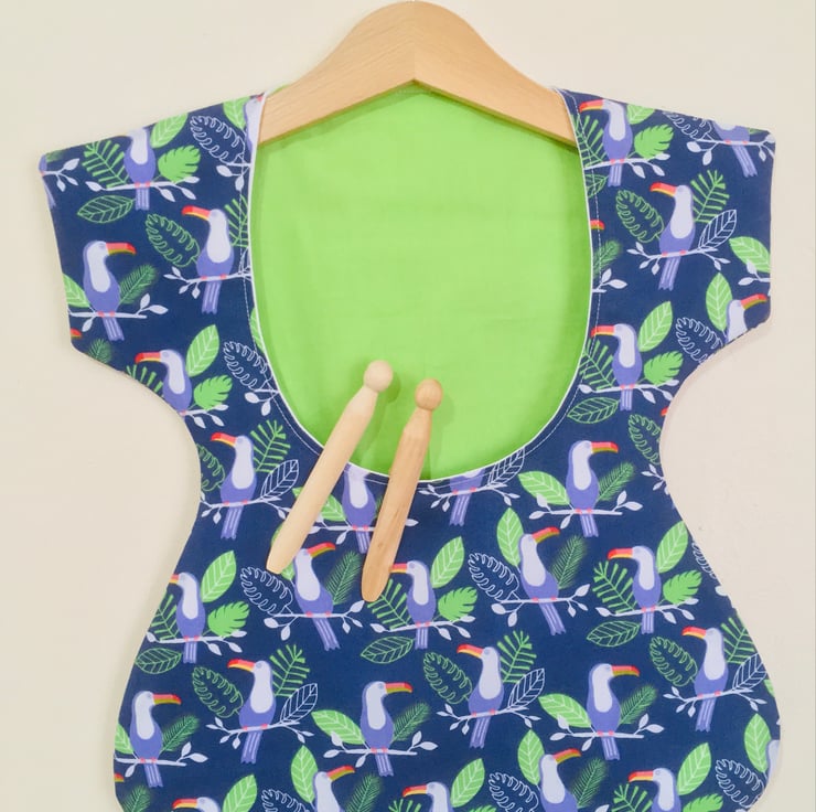 A dress shaped peg bag featuring toucans in a bright cotton fabric.