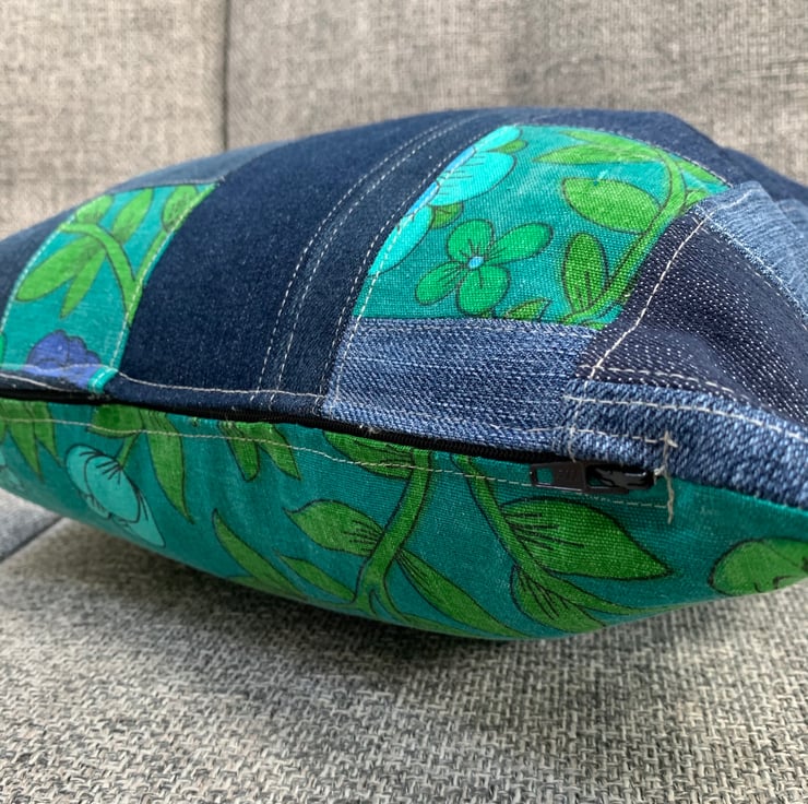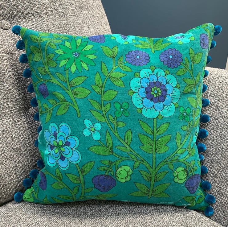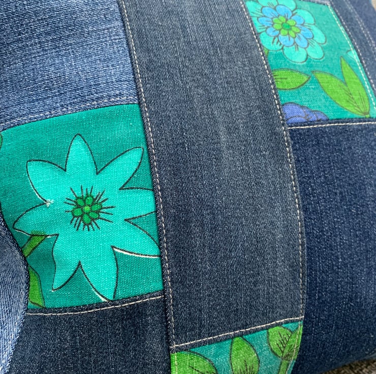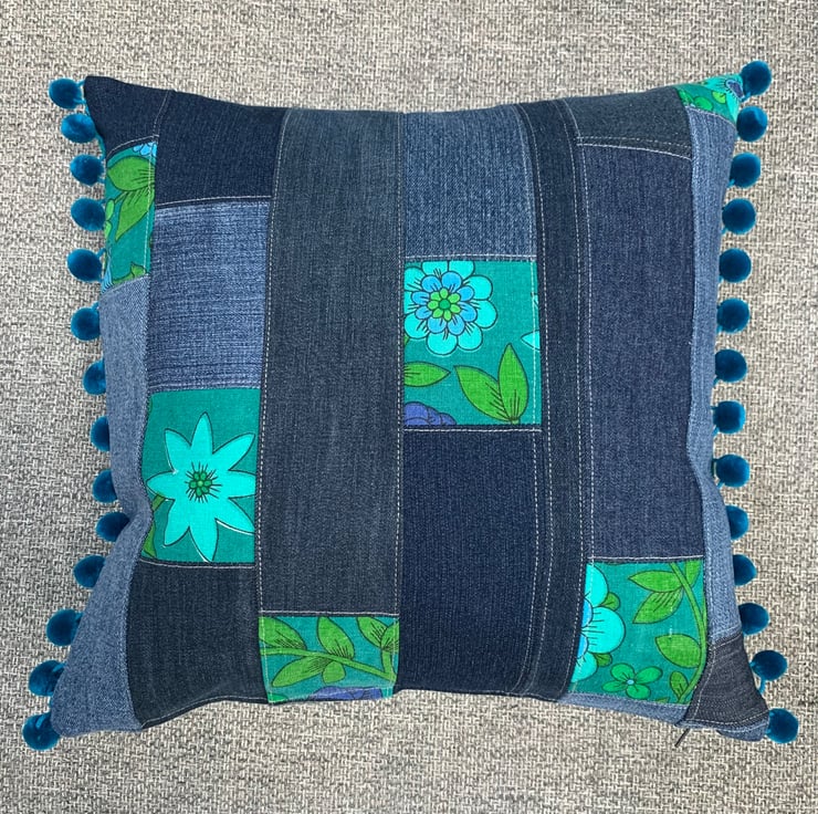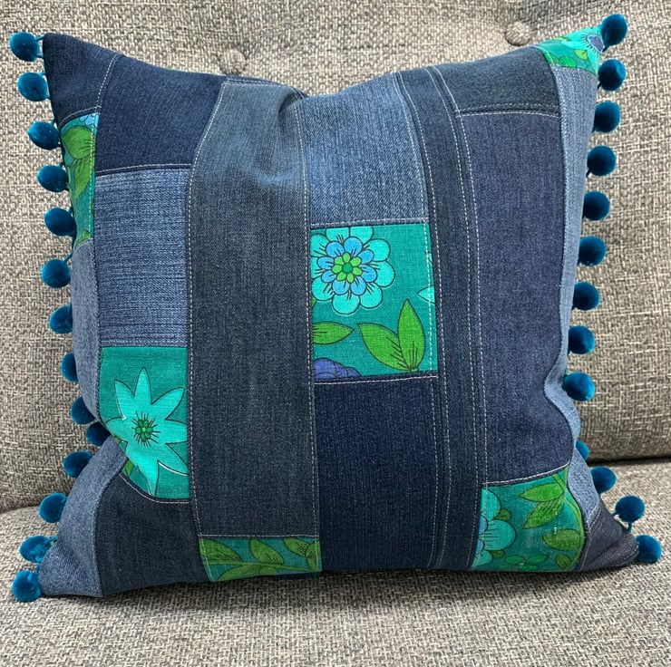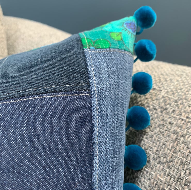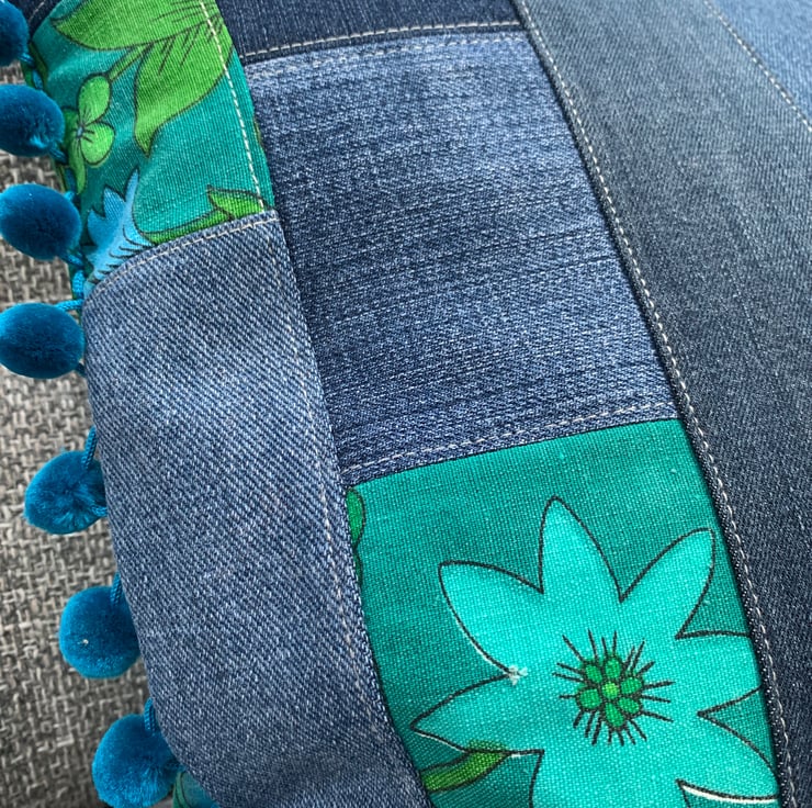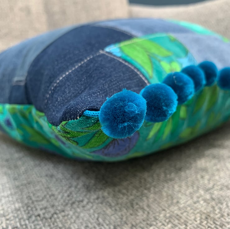 Two different looks in one cushion cover. One side is vintage 1970s Jonelle Roundelay cotton reclaimed from a tablecloth. The other is a patchwork of reclaimed denim taken from old jeans mixed with offcuts of Roundelay. The ends are trimmed with velvety teal pom-poms.