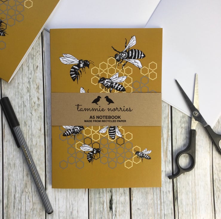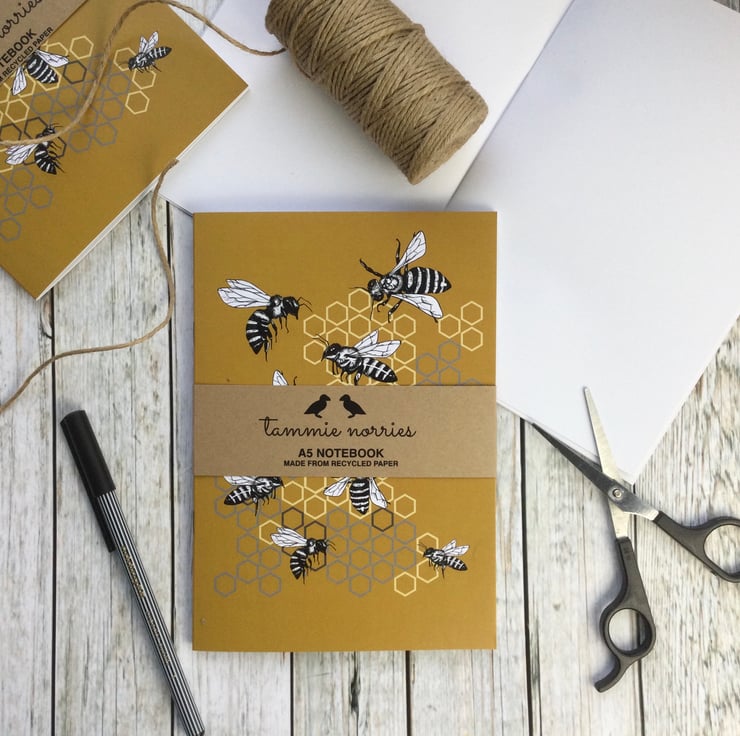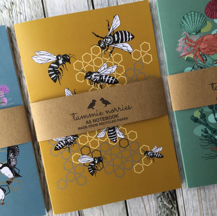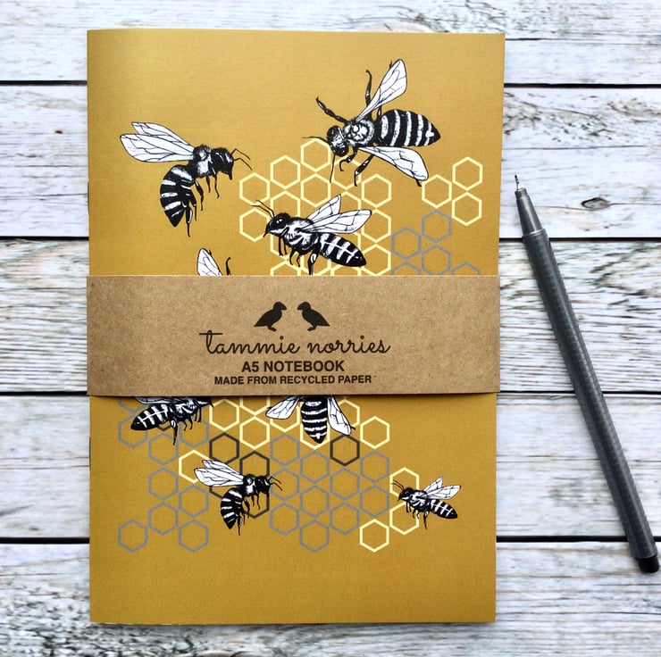 This A5 Rabble of Bees notebook is hand drawn, brightly coloured and eye-catching. This notebooks cover is printed on 100% recycled card, with the inner pages made from 100% recycled paper. I use a British company who print with new technology and eco-friendly toners who are committed to carbon offsetting.