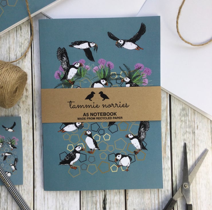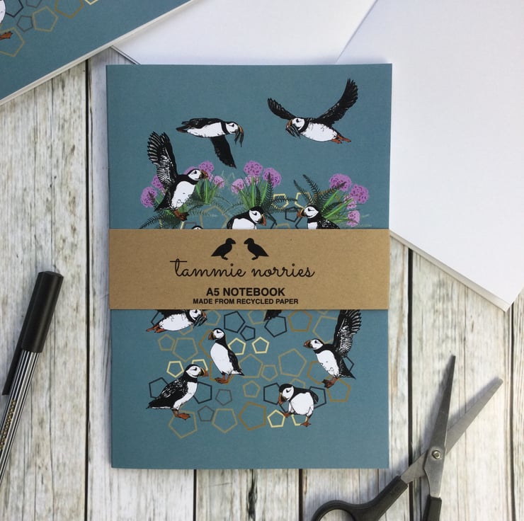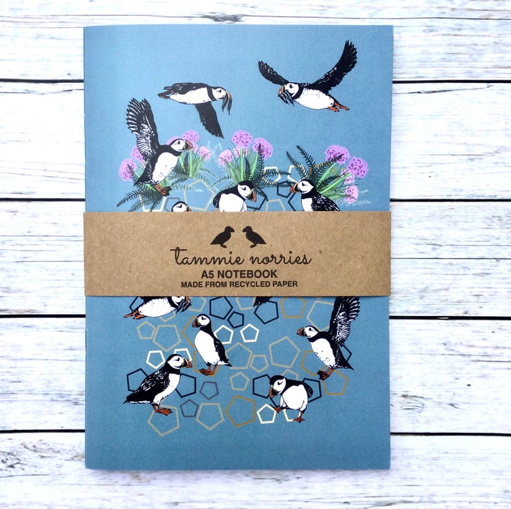 This A5 Circus of Puffins notebook is hand drawn, brightly coloured and eye-catching. This notebooks cover is printed on 100% recycled card, with the inner pages made from 100% recycled paper. I use a British company who print with new technology and eco-friendly toners who are committed to carbon offsetting.
