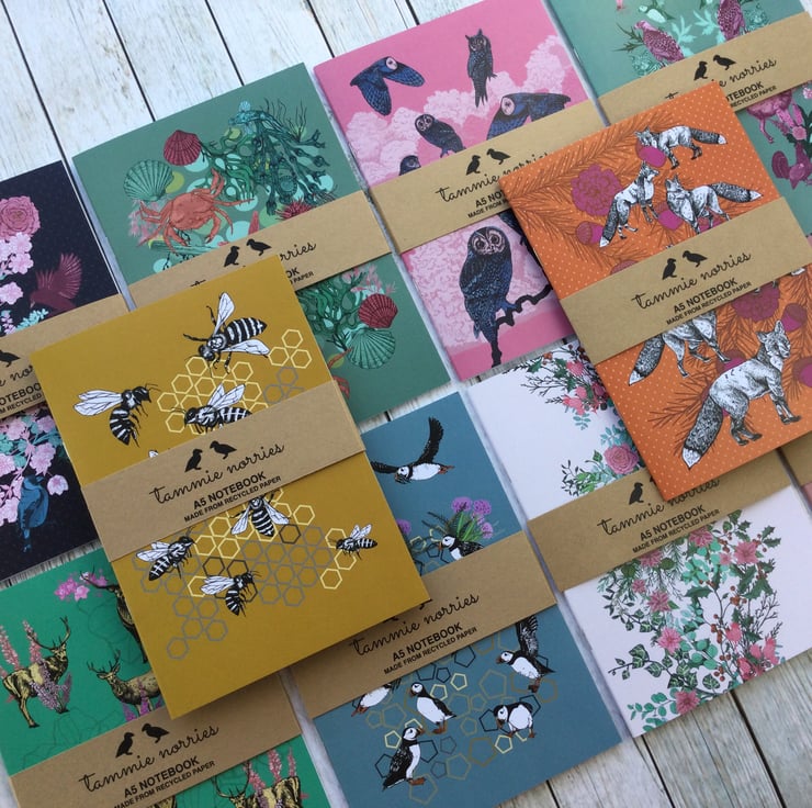 These notebooks are available individually or as a set in my shop. The other designs available are, A Circus of Puffins Notebook, A Bevy of Deer Notebook, A Parliament of Owls Notebook, A Rabble of Bees Notebook and a Rockpool notebook.