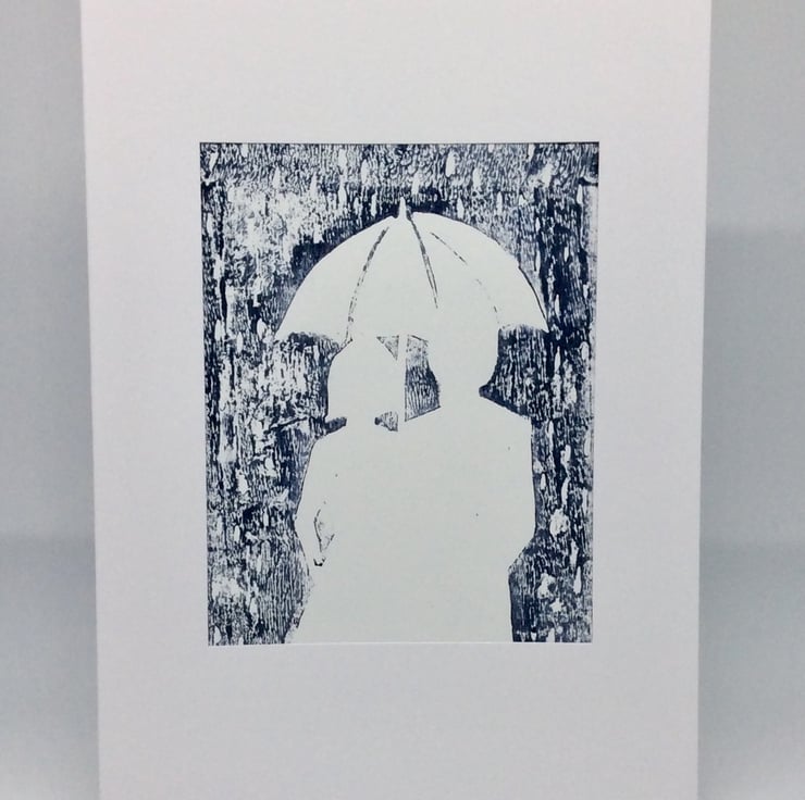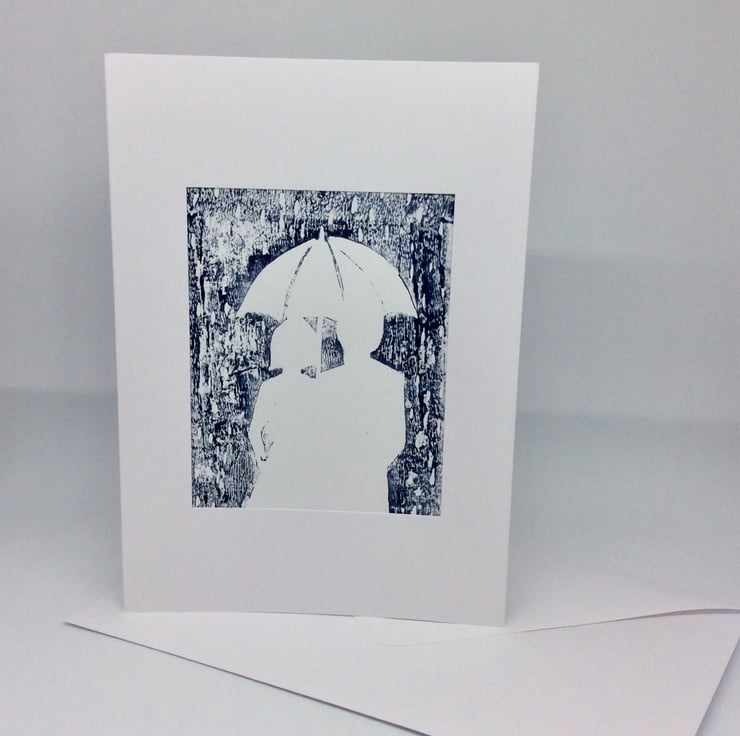 Keepsake, card and present in one. This design depicts a couple in silhouette walking in the rain under an umbrella. An original handmade lino cut, hand printed and set in a white, trifold aperture card (with matching envelope) ready to display and/or frame. The card is left blank for your own message and is A5.