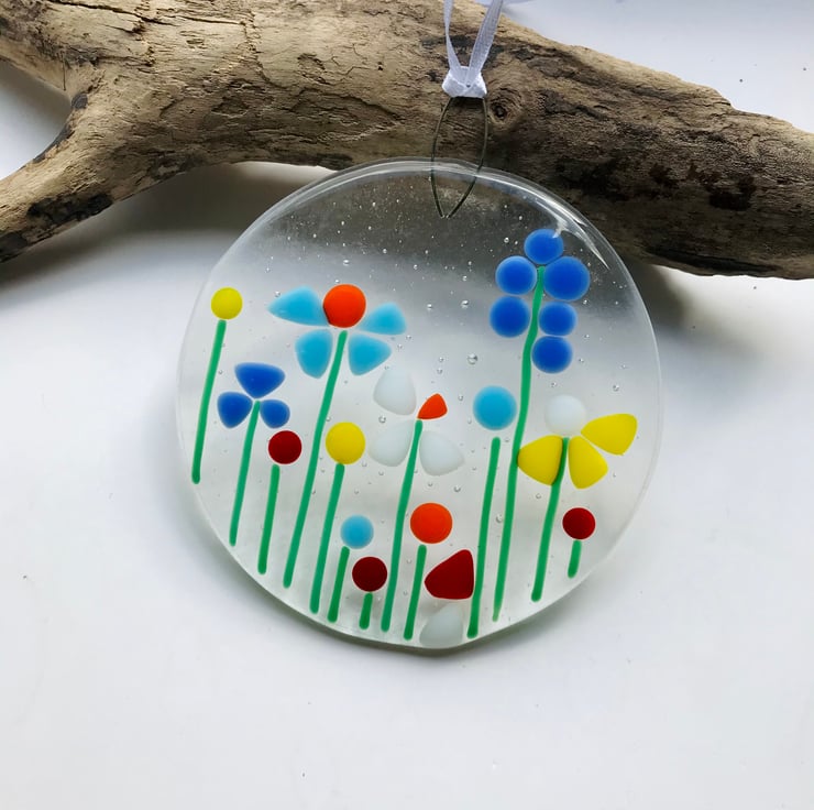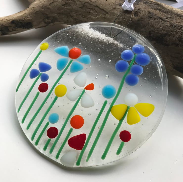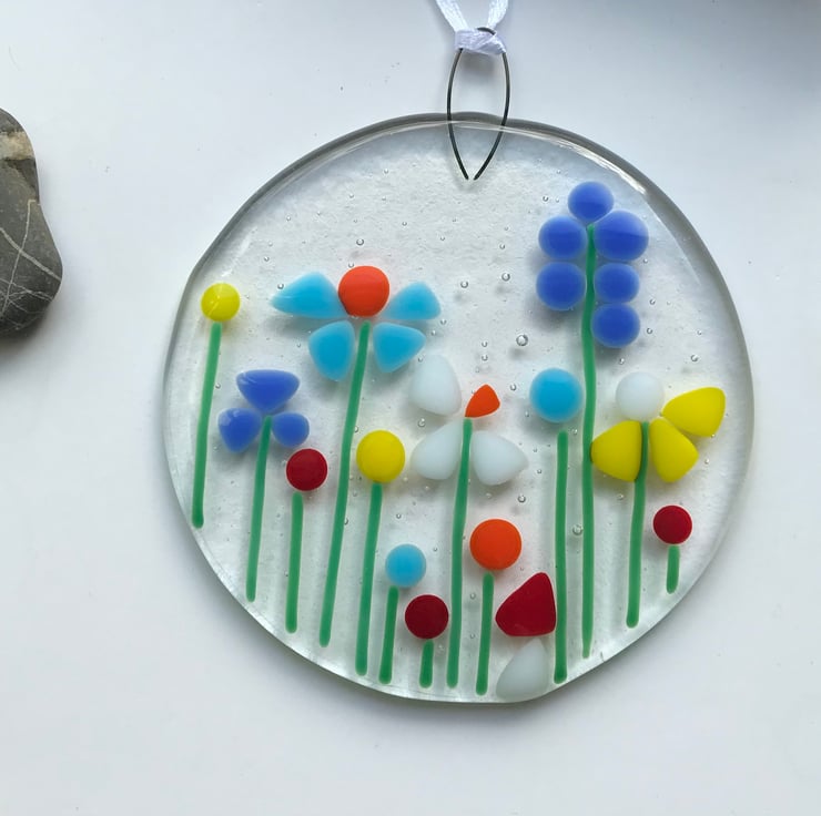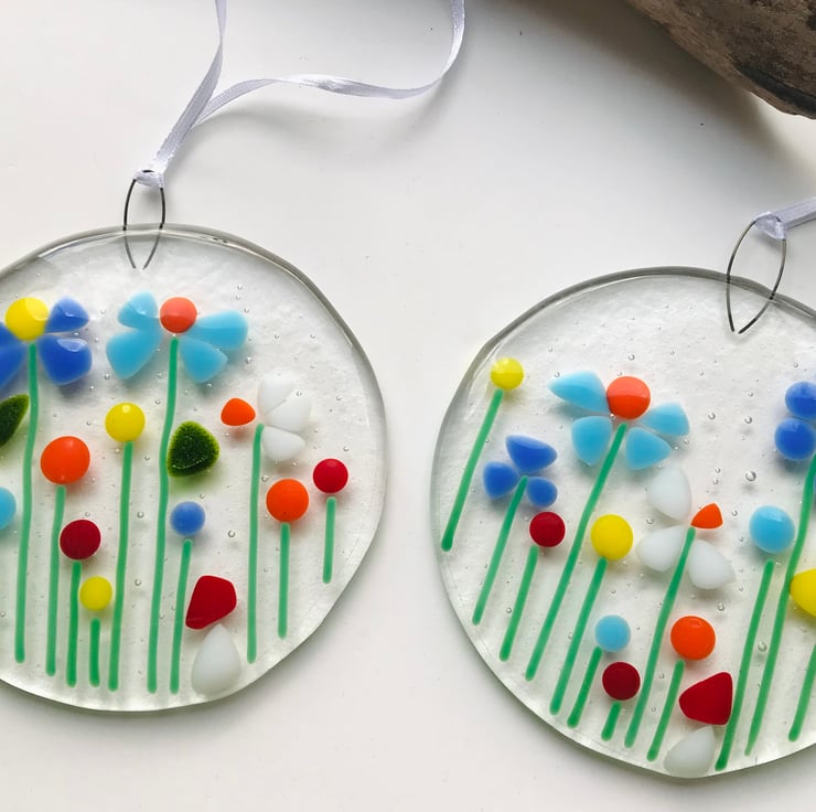 It is approximately 10 cm in width and height. It is made from two hand cut glass circles and a third layer of coloured glass for the flowers and it’s all fully fused in a kiln.