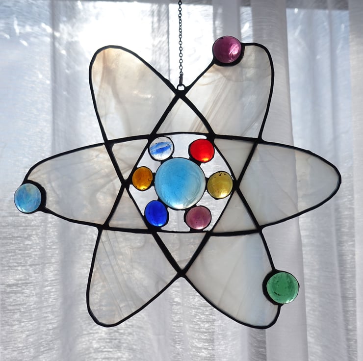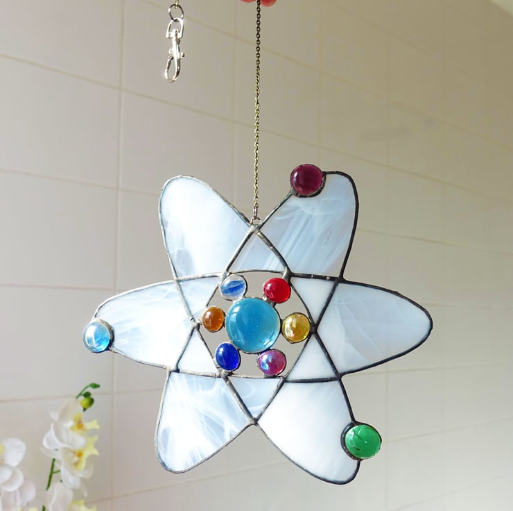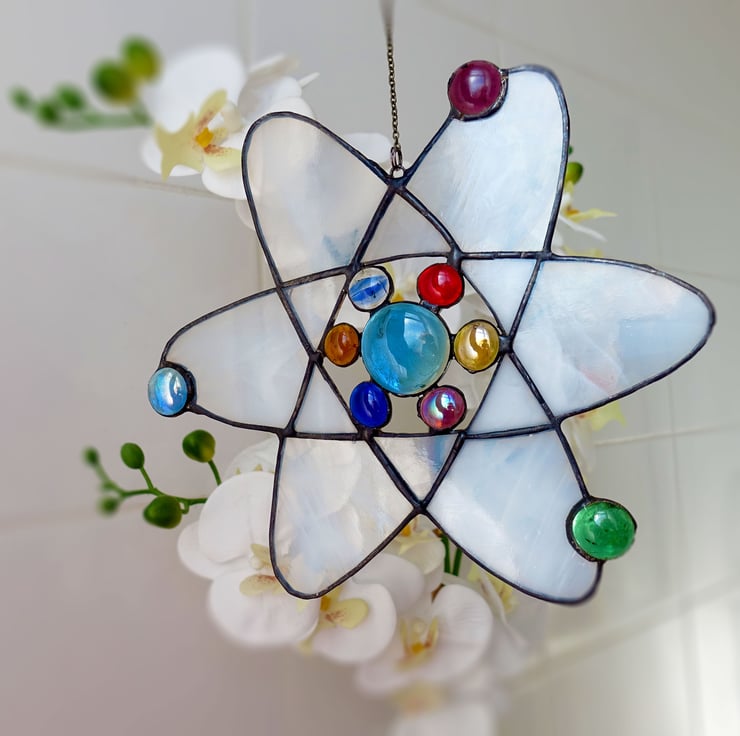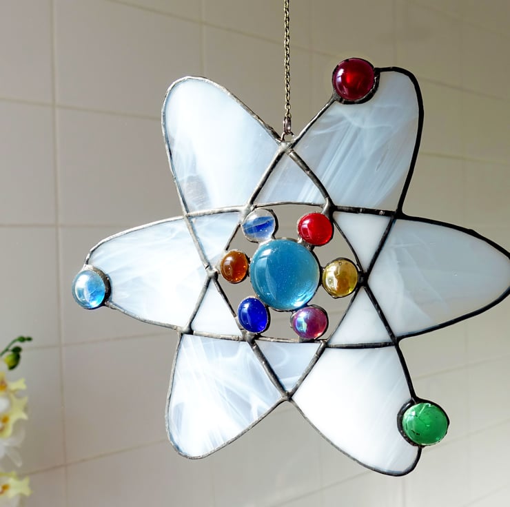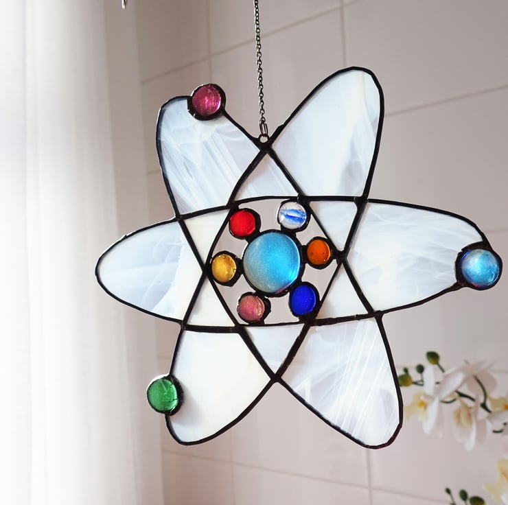 Scientific Atom molecule in Stained Glass. Made from white wispy with the electrons and protons made from colourful glass jewels. A real statement piece for your home.