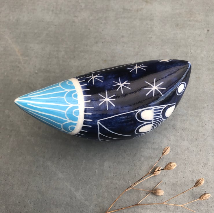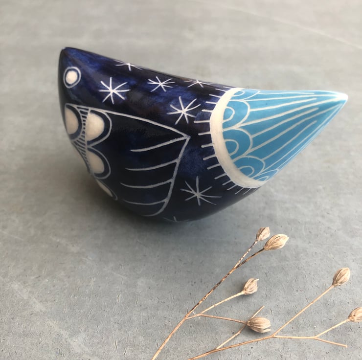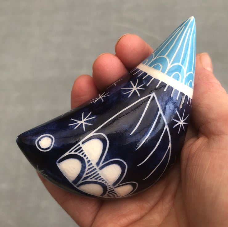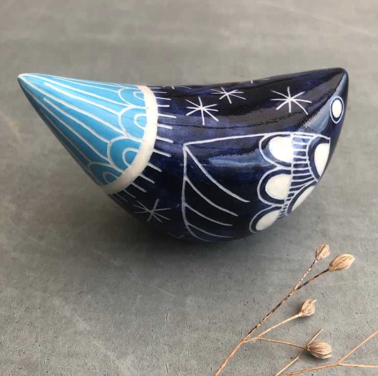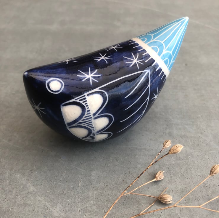 This decorative bird is hand made from white earthenware clay, decorated with coloured slip and finished with a hand drawn design using the scraffito technique.