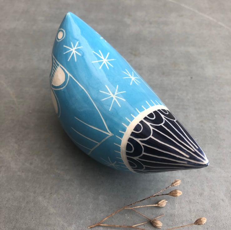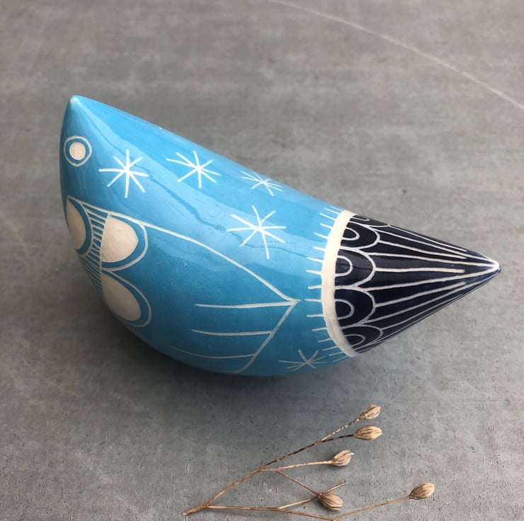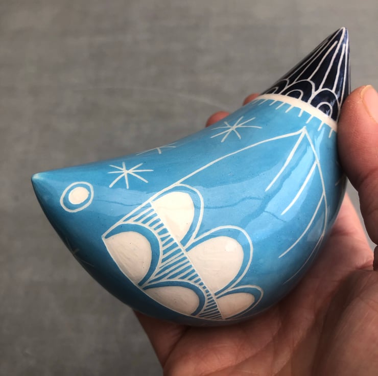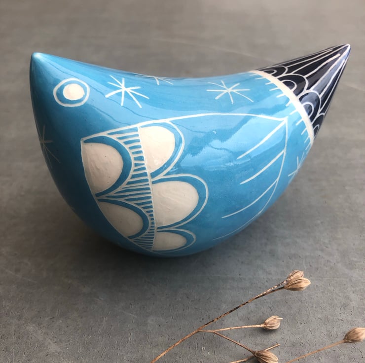 This decorative bird is hand made from white earthenware clay, decorated with coloured slip and finished with a hand drawn design using the scraffito technique.