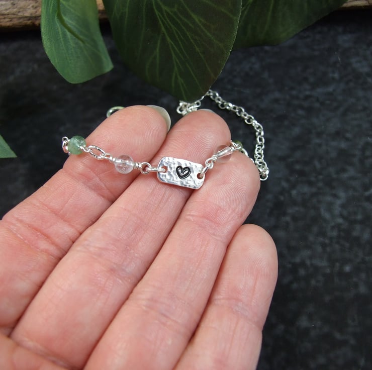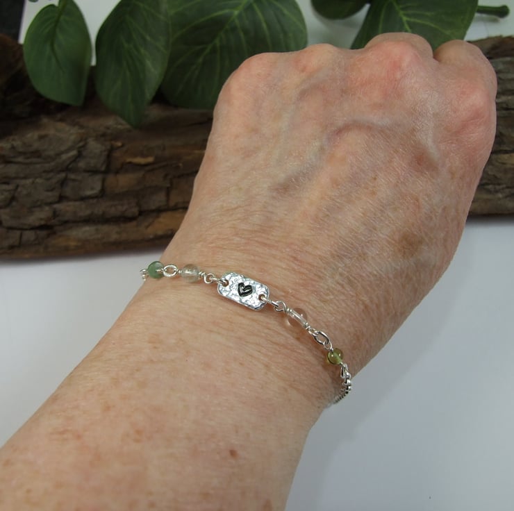 I have made the bracelet from a mixture of 2-3mm gemstone beads. The centre is sterling silver tag cut by hand drilled and hammed for texture than stamped with a little heart.