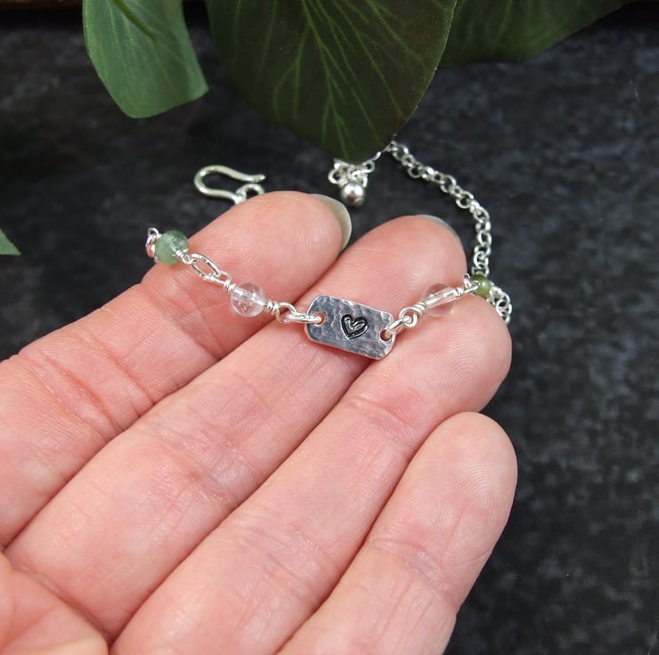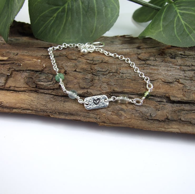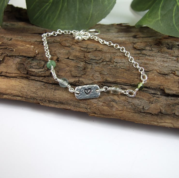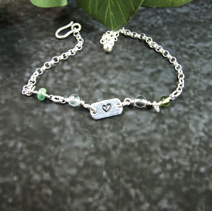 Sterling Silver bracelet with tiny heart tag and Emerald, Aquamarine, Rock Crystal and Peridot.