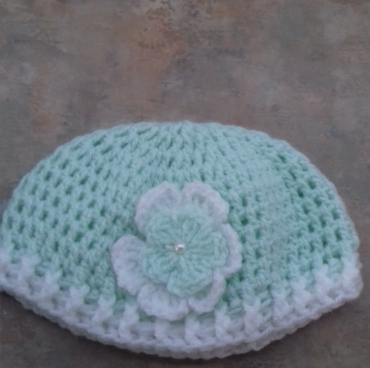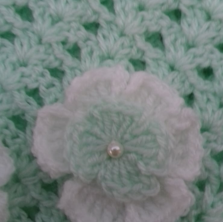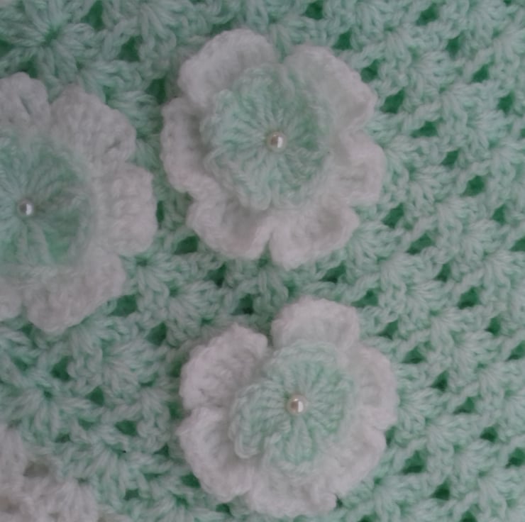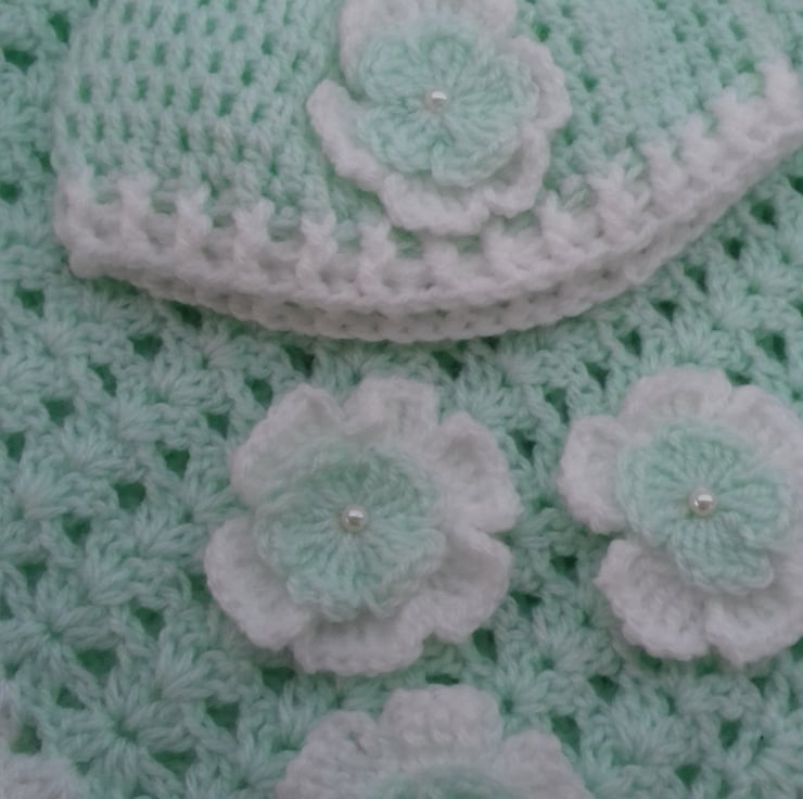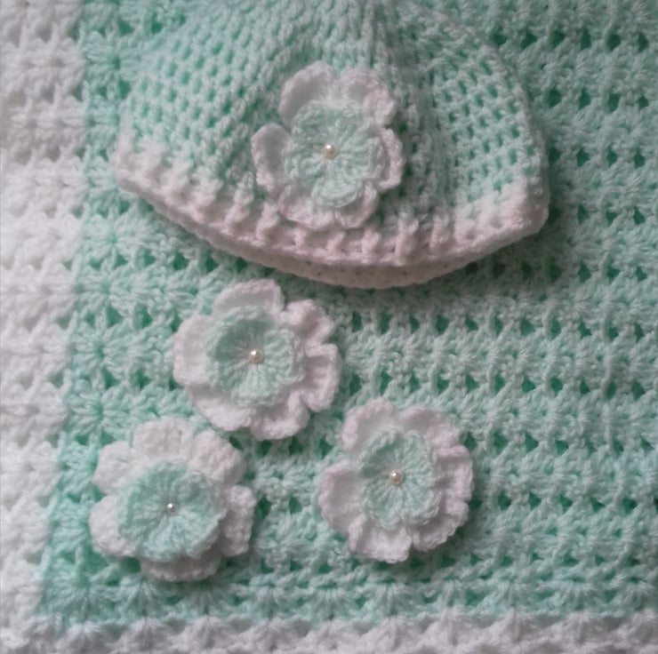 This set is a crocheted baby hat with matching blanket in pale mint green with white boarder and crocheted flowers in white with the mint and a white bead in the centre of the flowers.