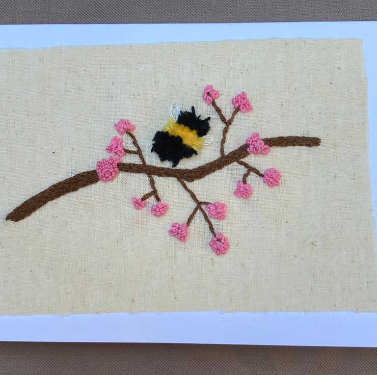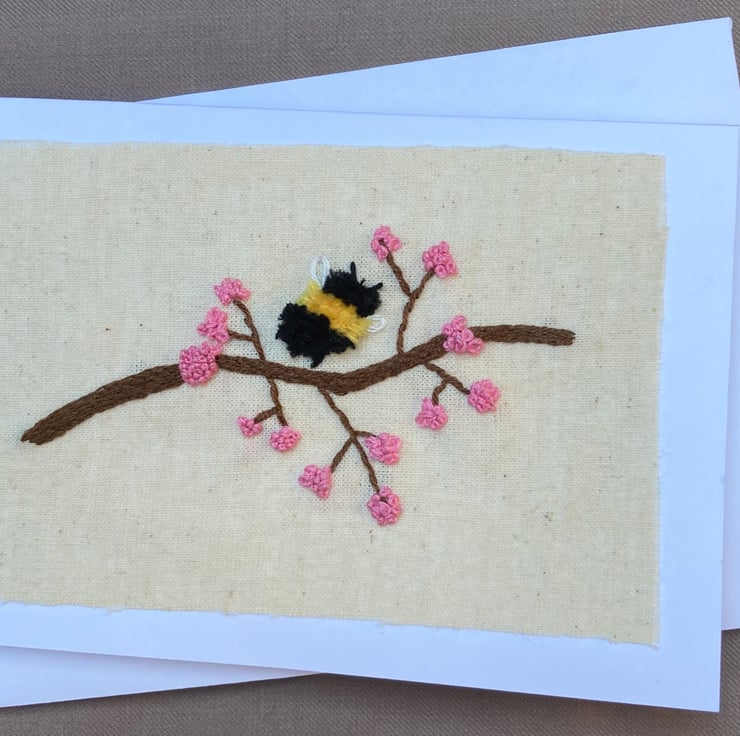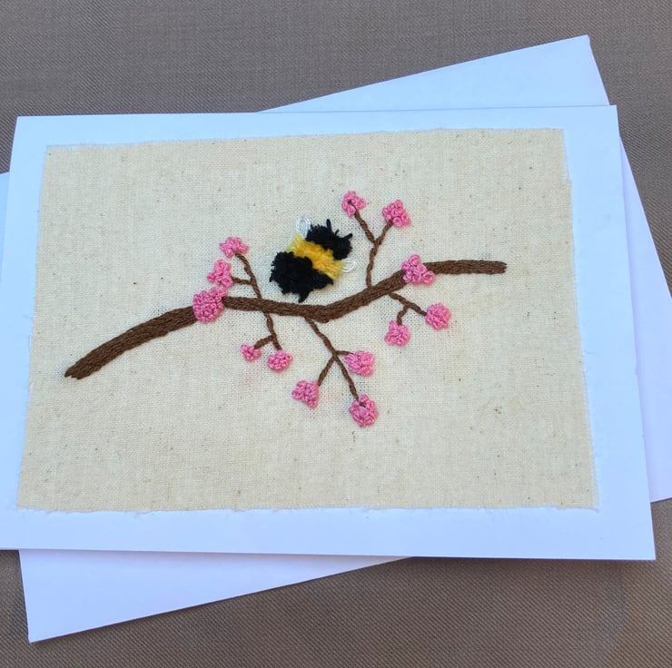 This charming little fluffy bee & beautiful blossom have been hand embroidered on cream linen and mounted on a white greetings card. The card is 4" x 6" and has been left blank inside for your own message.